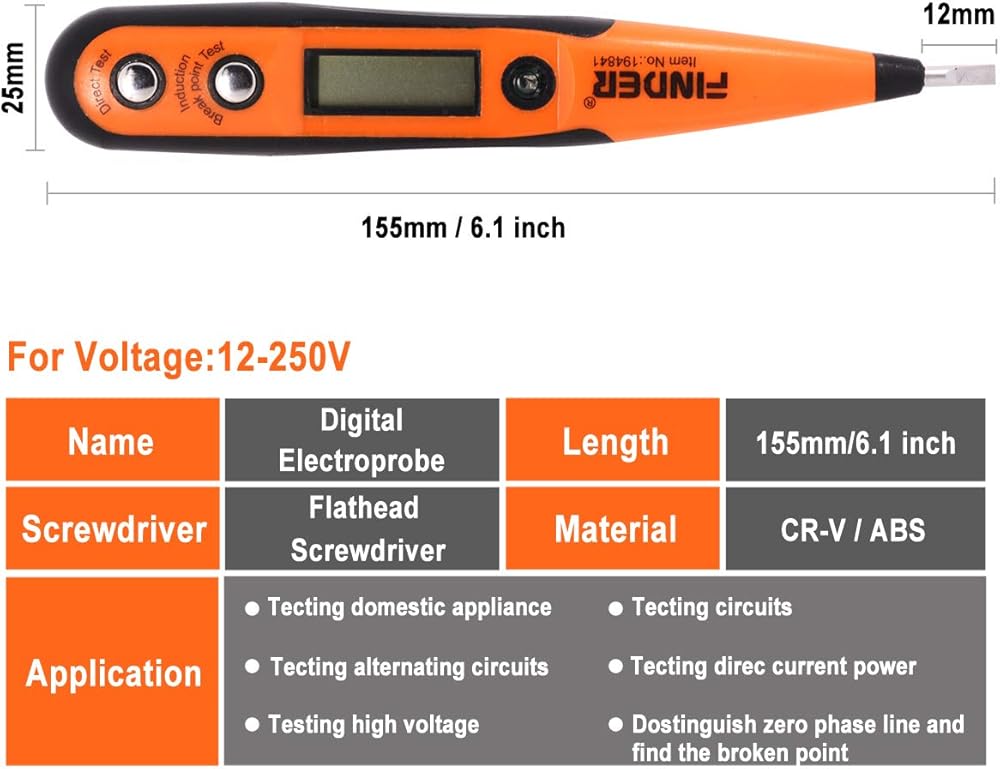المسبار الكهربائي المستخدم في اختبار دوائر التيار المتردد ودوائر التيار المستمر، يتراوح الجهد من 12-220 فولت، والقيمة الأخيرة هي جهد الاختبار. عندما يكون الجهد الفعلي أقل من 70% من القيمة العالية، تعرض شاشة ال سي دي القيمة المنخفضة (على سبيل المثال عندما يكون الجهد الفعلي 150 فولت، تعرض شاشة ال سي دي 12 فولت 36 فولت 55 فولت 110 فولت)