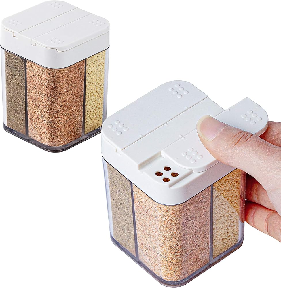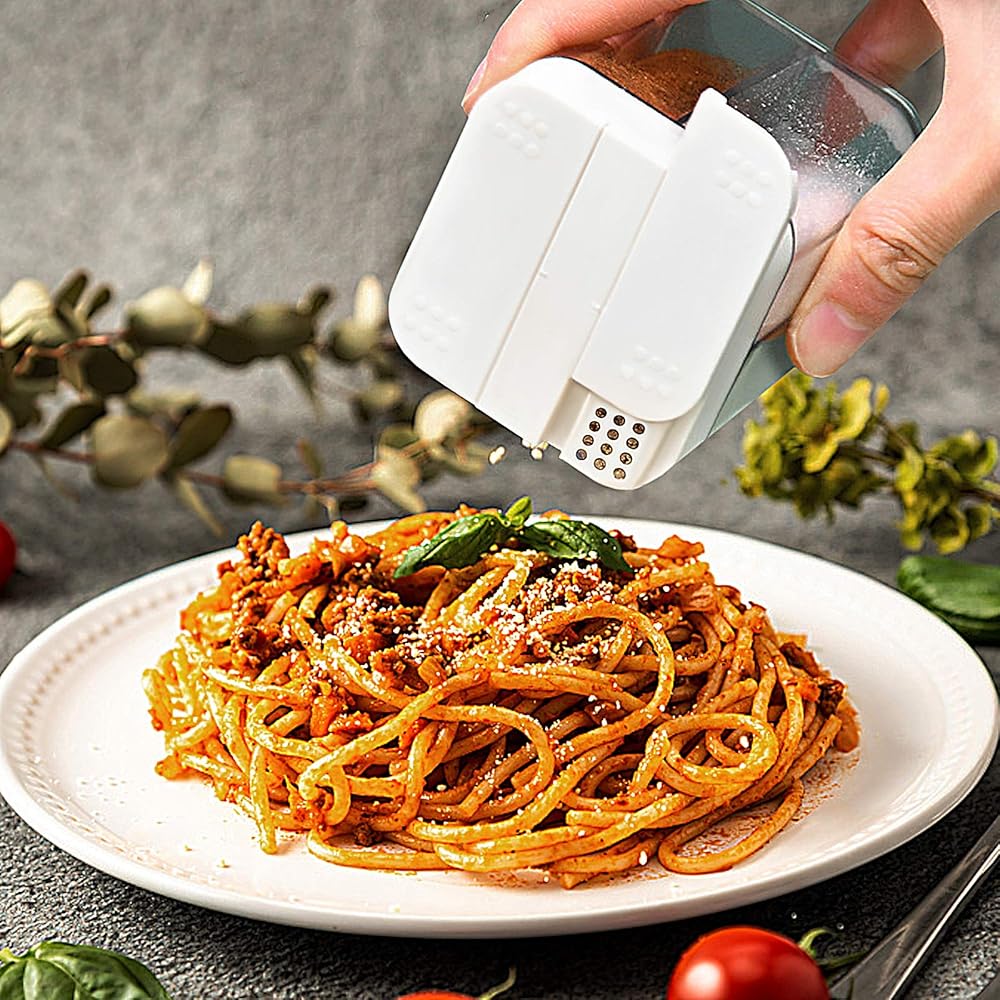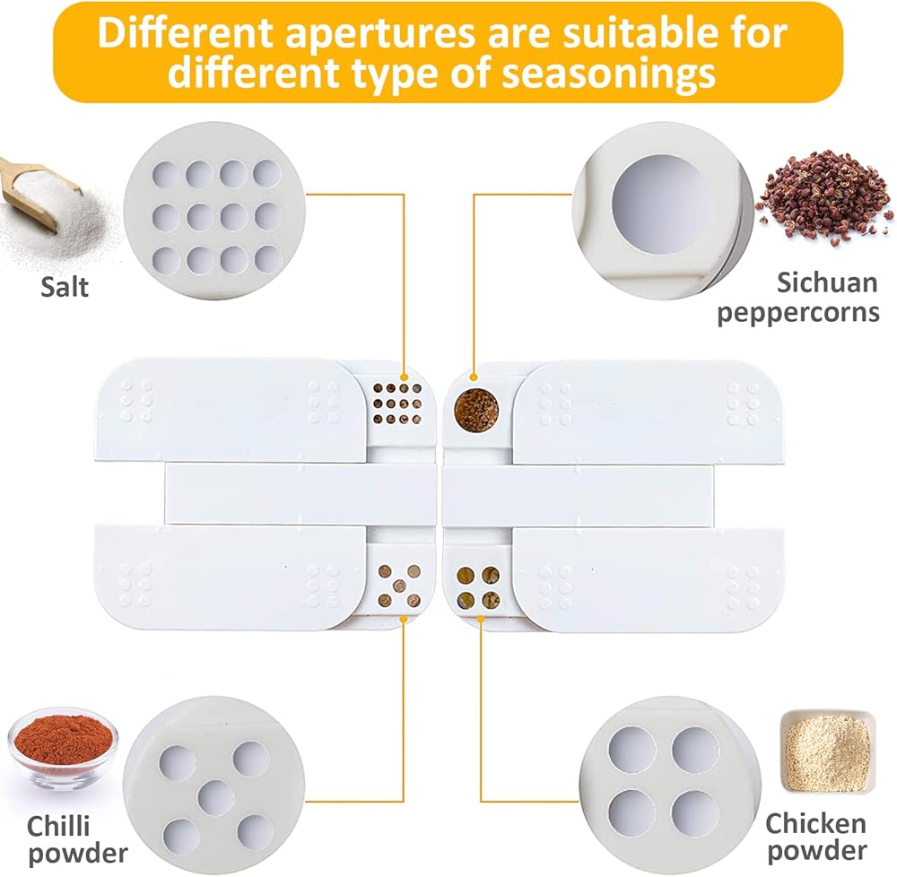 أغطية منزلقة: هناك 4 أنابيب توابل و2 غطاء أبيض مع فتحات قابلة للتعديل في كل موزع التوابل لدينا، وبالتالي يمكنك تحريكه من الأمام إلى الخلف لفتح شبكات مختلفة وإضافة لذيذة إلى طعامك.