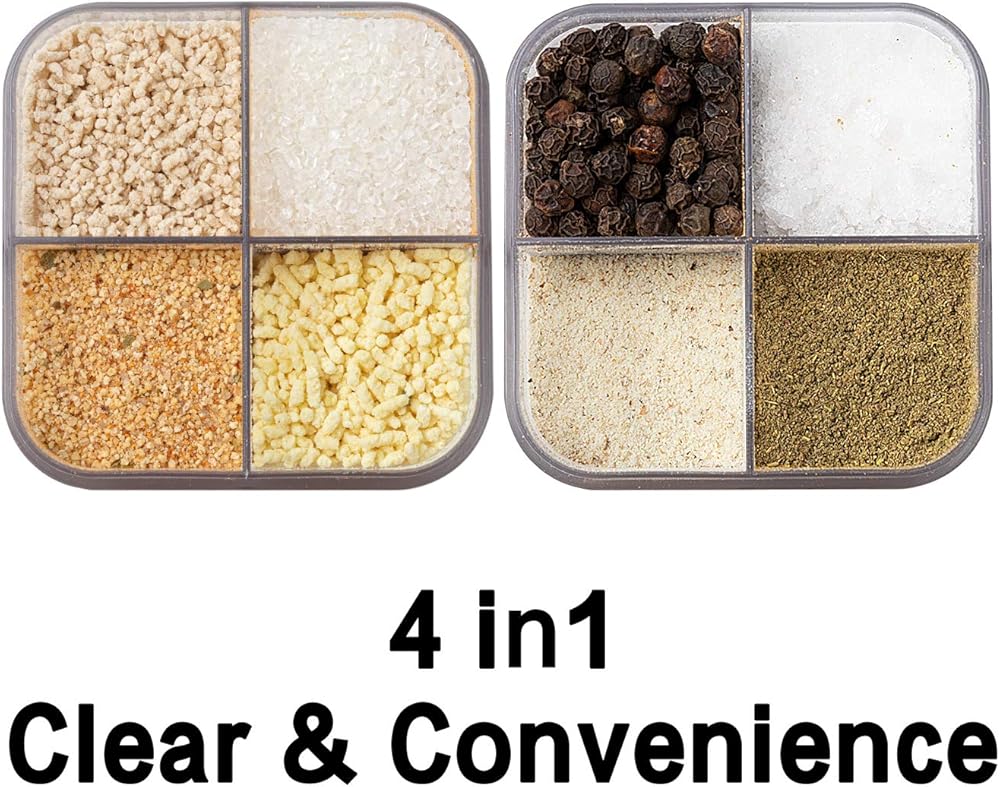تصميم 4 في 1: مع تصميم 4 في 1، يمكن لهز الملح والفلفل لدينا استيعاب 4 أنواع مختلفة من التوابل في نفس الوقت، كافية لتلبية الاحتياجات المختلفة للنكهات أثناء أخذ أماكن صغيرة في مطبخك.