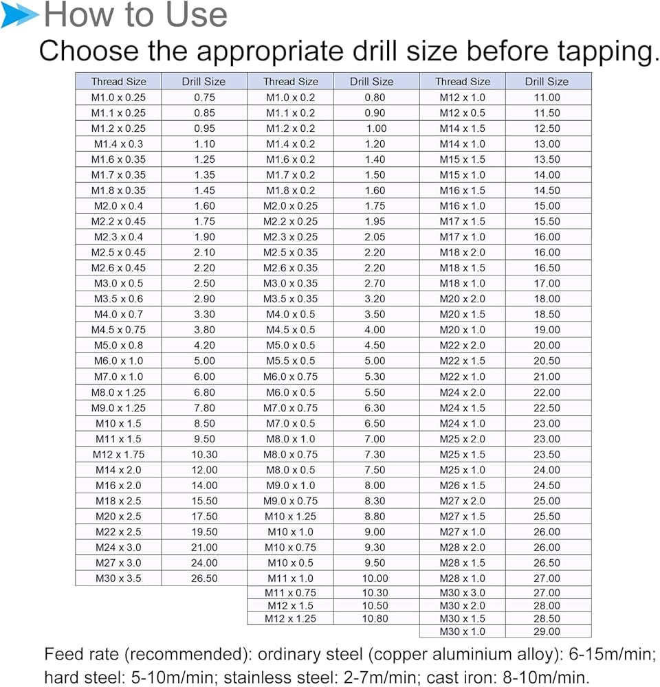★ Useful Tips --- Control speed based on material hardness. Add appropriate tapping oil for higher quality internal threads and more durable taps. The tapping depth should not exceed 1.5 times the diameter (eg: diameter=6mm (M6), maximum tapping depth=9mm). The tapping angle should be 90 degrees vertical and stable.