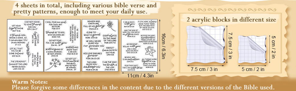 محتويات العبوة: سوف تحصل على 4 قطع من الطوابع الواضحة لآية الكتاب المقدس للصناعة وقطعتين من أدوات كتل الطوابع الأكريليك في حجمين مختلفين، والتي تتميز بنصوص متنوعة من الكتاب المقدس وأنماط دقيقة، كافية لتلبية احتياجاتك المختلفة في الاستخدام والاستبدال؛ يرجى ملاحظة أن هناك طبقة واقية على لوح الأكريليك؛ يرجى إزالته قبل الاستخدام