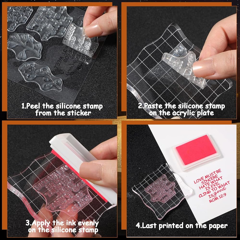سهلة التشغيل: هذه الطوابع الشفافة للحرفية سهلة الاستخدام، يمكنك استخدام نمط ختم واحد، ووضعه على ألواح الأكريليك، ووضع الحبر أو الصبغة عليه وطباعته على الختم على الورق أو البطاقات، وأخيرًا انتظر حتى يجف الطلاء، ثم ستحصل على تأثير بصري جميل