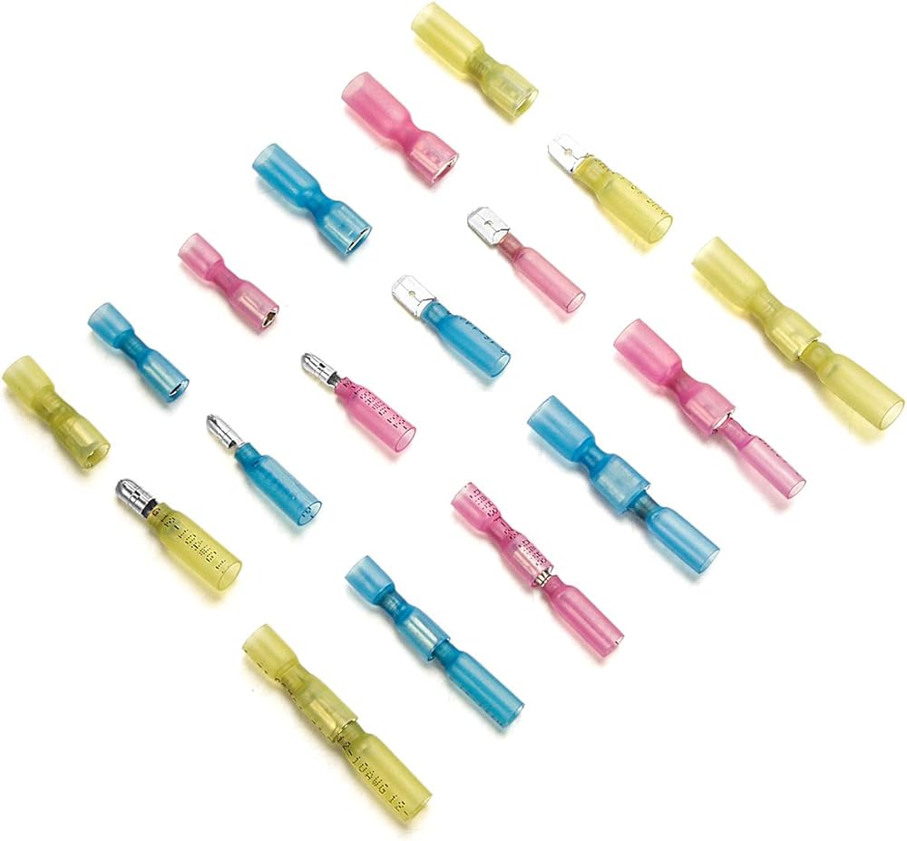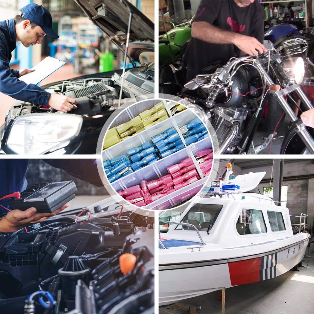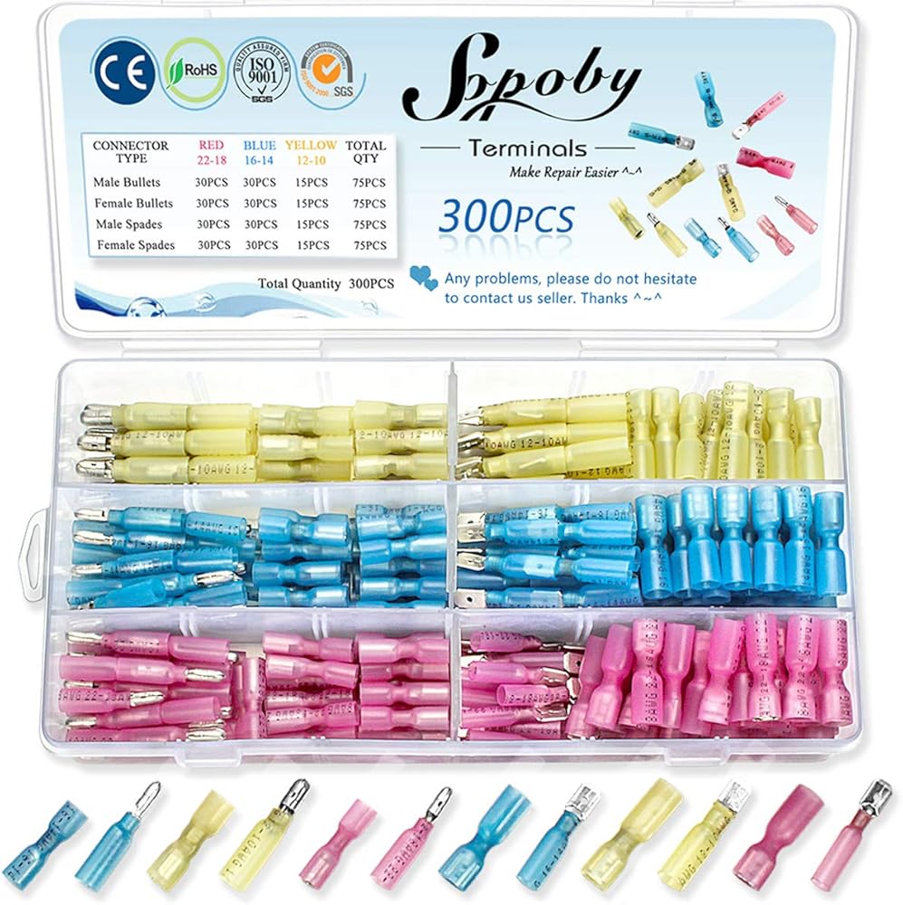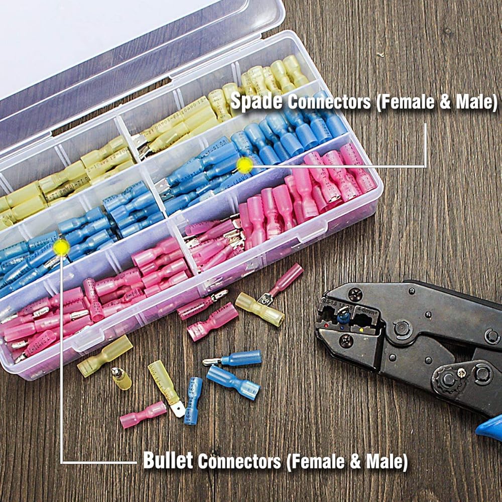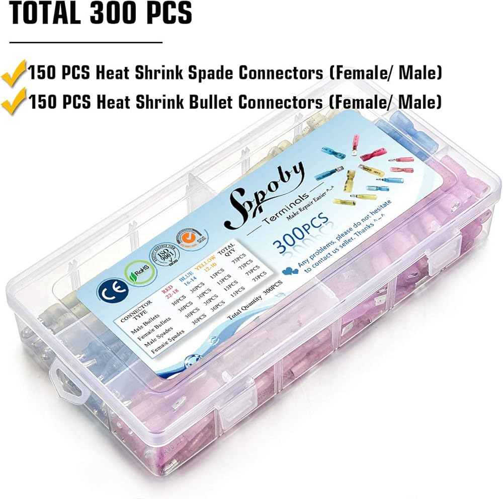 ✔ 【Package】 300PCS heat shrink connectors (150PCS SPADE connectors + 150PCS BULLET connectors ). These electrical connectors will fit any wire from 22-10 AWG.