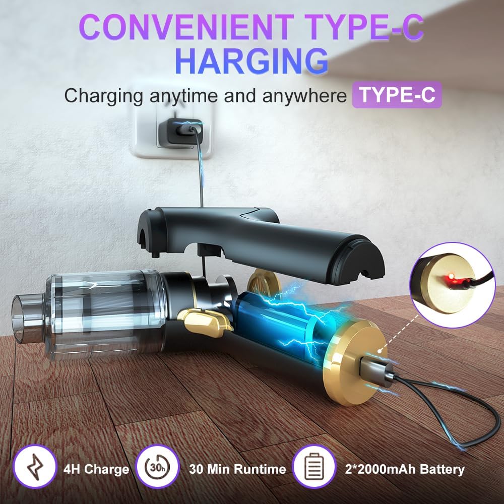 【مكنسة سيارة لاسلكية قوية】: بفضل تصميمها خفيف الوزن وبدون سلك، يمكن أن تصل إلى الزوايا التي يصعب الوصول إليها حيث يصعب تشغيل المكانس الكهربائية الكبيرة. يمكن للمكنسة الكهربائية الصغيرة التحرك بحرية عند تنظيف السيارات والكرسي والأريكة. قوية بما يكفي مع ضوضاء أقل واستهلاك أقل للطاقة كمكنسة كهربائية صغيرة. اشحن عبر كابل شحن من النوع سي. يمكنك الشحن في أي مكان تريده.