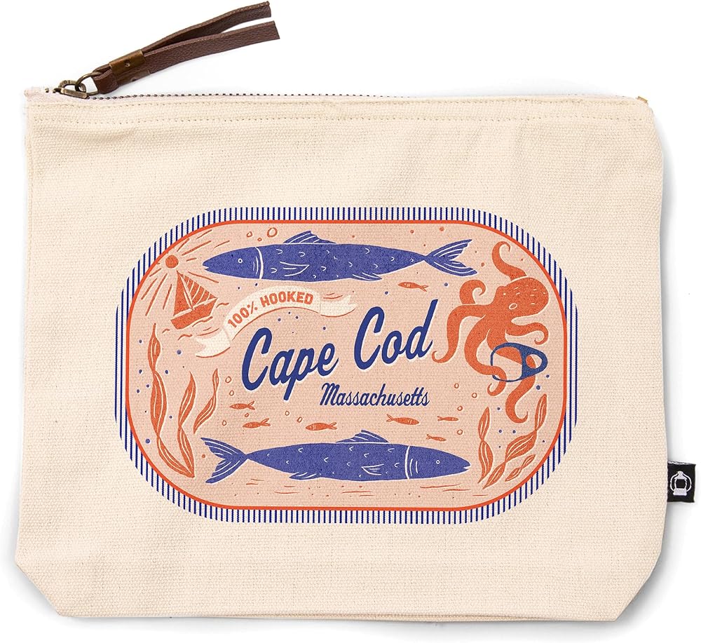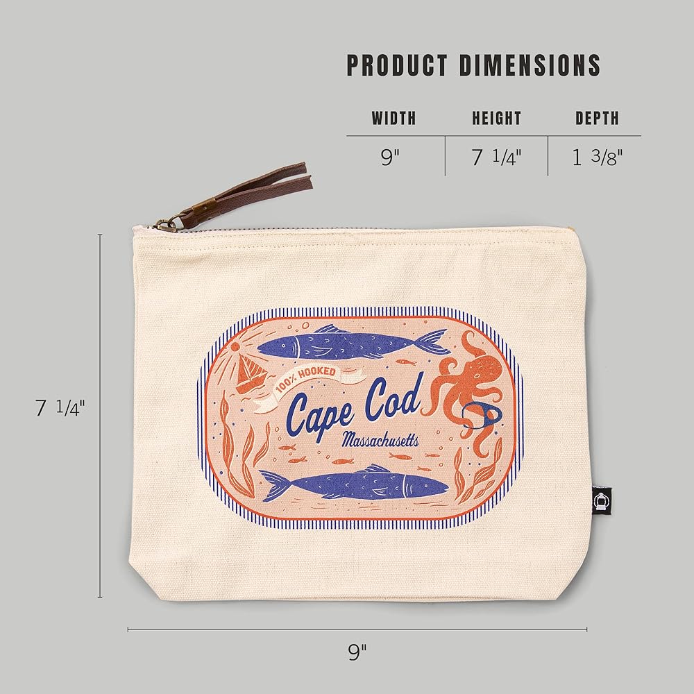 This original, high-quality cotton Zipper Pouch from Lantern Press boasts sharp detail and vivid imagery of Cape Cod, Massachusetts, Dockside Series, 100% Hooked, , 100% Cotton Zipper Pouch, Travel Accessory, Go Bag.
