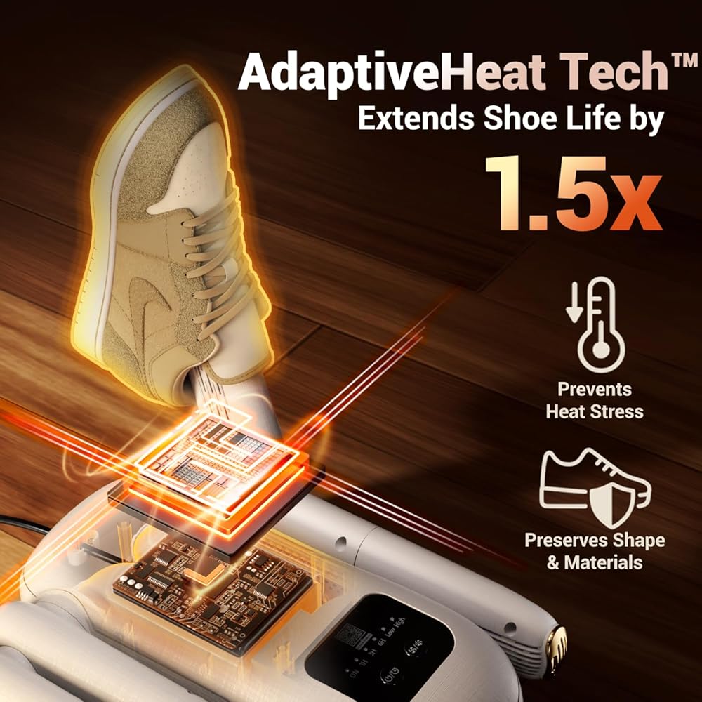 هادئ لغرف النوم، وآمن للمواد - ضوضاء منخفضة للغاية للاستخدام في وقت متأخر من الليل؛ تساعد الحماية من الحرارة الزائدة والإمالة بالإضافة إلى الإغلاق التلقائي على حماية الجلد والجلد المدبوغ والشبكة. أسلوب الحرارة اللطيف يدعم العناية بالمواد - الإجابة على السؤال "هل سيؤدي المجفف إلى إتلاف حذائي؟" بثقة.