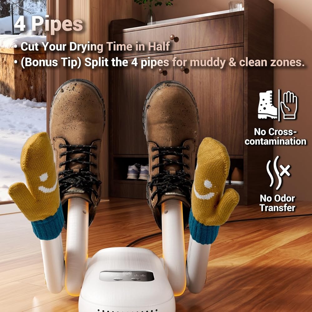 أكثر من مجرد أحذية: قفاز حقيقي/مجفف جورب - يعمل كمجفف قفازات كهربائي ومجفف جورب أيضًا - قفازات مبللة جافة بعد التزلج، وتجديد الجوارب بين الألعاب، وإدراج دافئ قبل صباح بارد. يساعد الإعداد متعدد الاستخدامات العائلات على تدوير المعدات خلال الأسابيع المزدحمة.