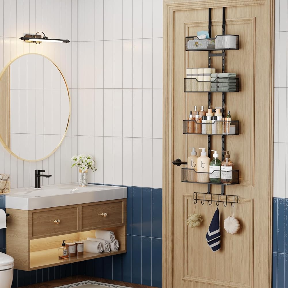 【تصميم قابل للتعديل】: يمكن تعديل ارتفاع سلة شماعات الحقيبة ليناسب ارتفاع الحقيبة، مما يقلل من احتمالية الضغط على الحقيبة وتشوهها. تستفيد الخطافات الستة السفلية من ارتفاع الباب بالكامل لتحسين مساحة التخزين.