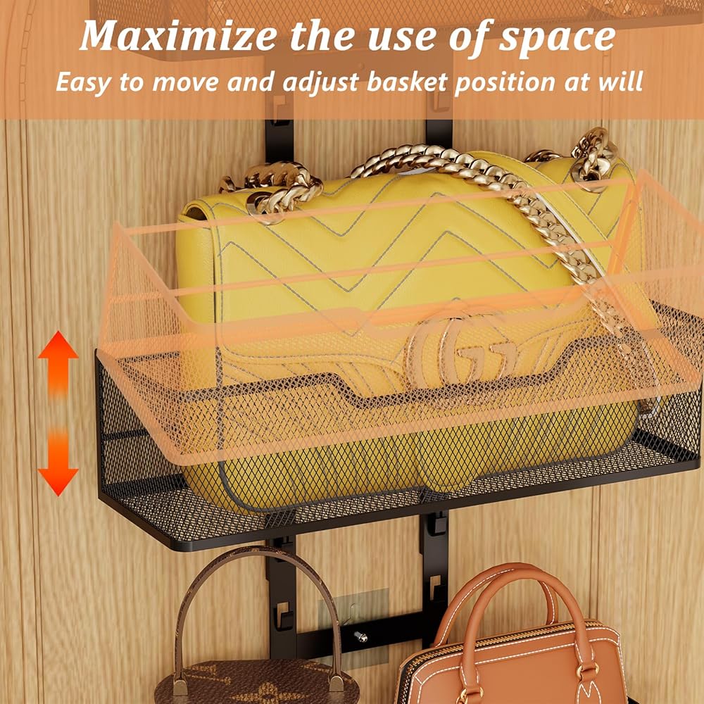 【حجم الحقيبة القابلة للتخزين】: الارتفاع الإجمالي لرف المحفظة هو 46 بوصة، حجم السلال الأربع يصبح أكبر تدريجيًا، أصغر سلة 15.2*4*4.8 بوصة، أكبر سلة 16.8*6*5 بوصة. يمكن للطبقة العليا تخزين المحافظ والحقائب المطوية، ويمكن للطبقة السفلية تخزين الحقائب الكبيرة بشكل منفصل. يمكن للخطافات تعليق الحقائب الصديقة للبيئة وأكياس القماش وحقيبة الهدايا.