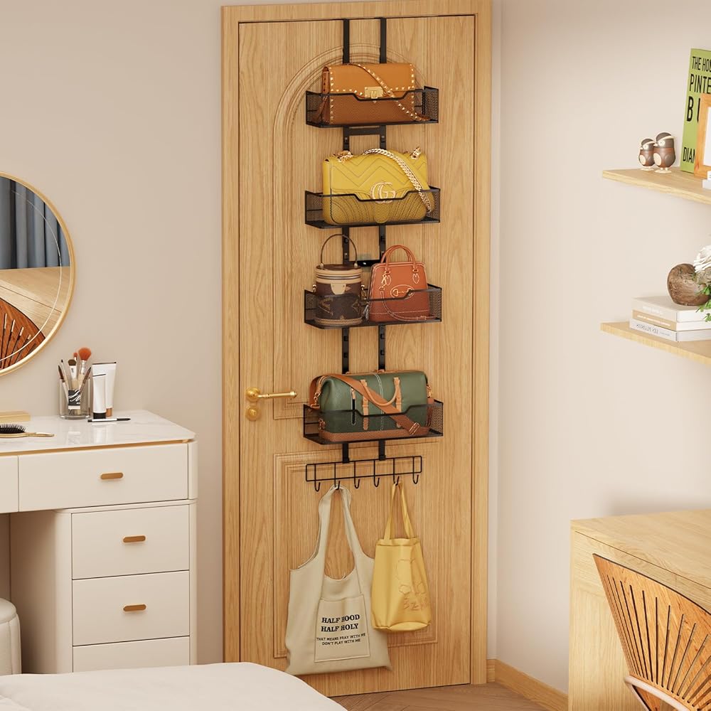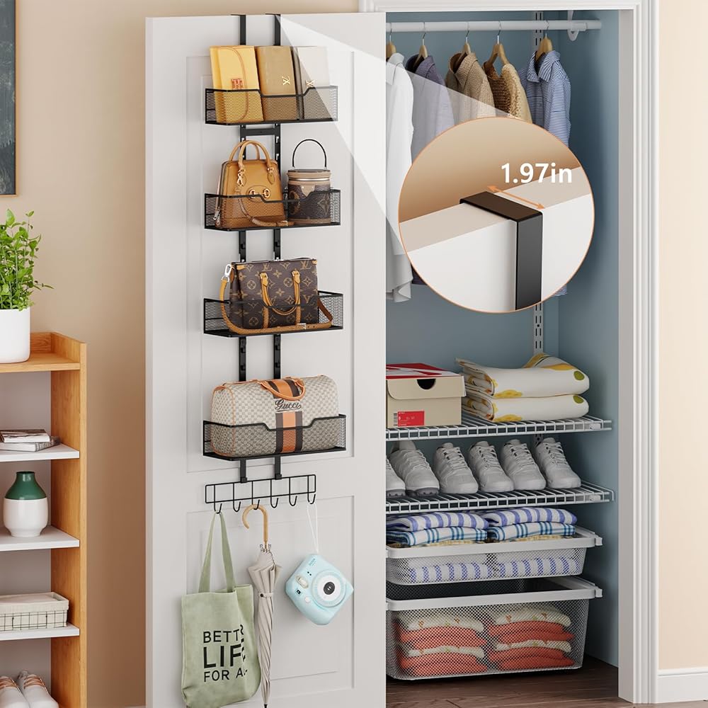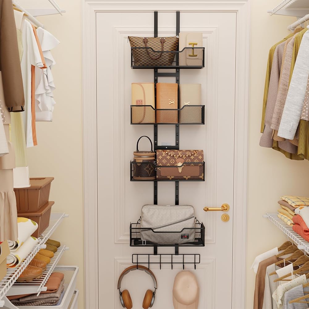 【تصميم باب معلق】: يمكن لشماعة المحفظة تعليق الأبواب التي يصل سمكها إلى 1.78 بوصة. منظم المحفظة يتم تعليقه في المداخل، والخزائن، وغرف النوم. امنح حقيبتك مساحة تنظيم كاملة، وحافظ على المساحة أنيقة.