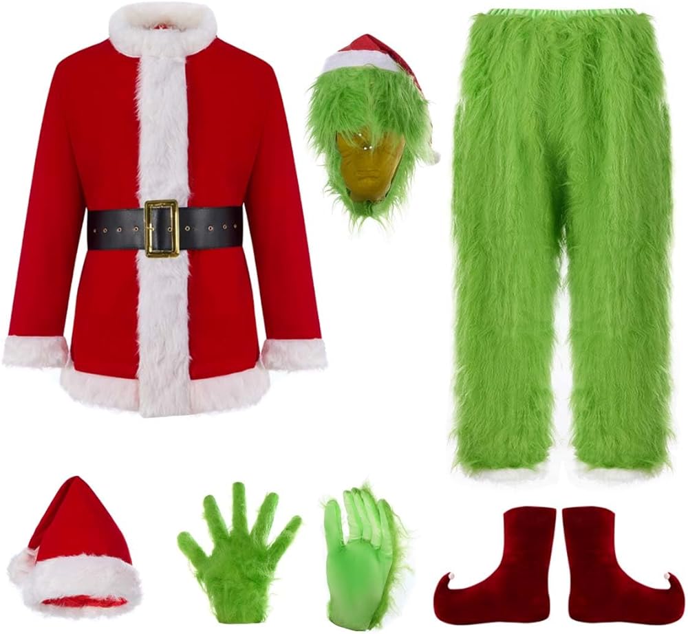 • THE COSTUME SET INCLUDES - 7PCS totally contains: Red santa hat with white fur edging & pompom decoration + eco friendly latex full mask with red santa hat assotiated + Festive red santa claus top + Black belt with buckle + A pair of green furry gloves + Green furry pants with elastic waist + A pair of red velvet santa hat shaped footwear; With all these you can be what are are cosplaying.
