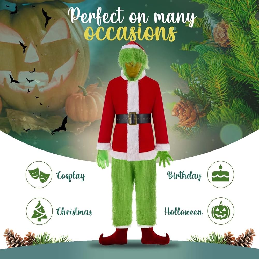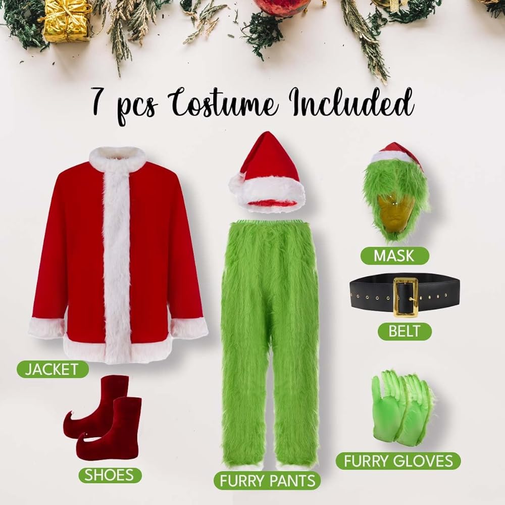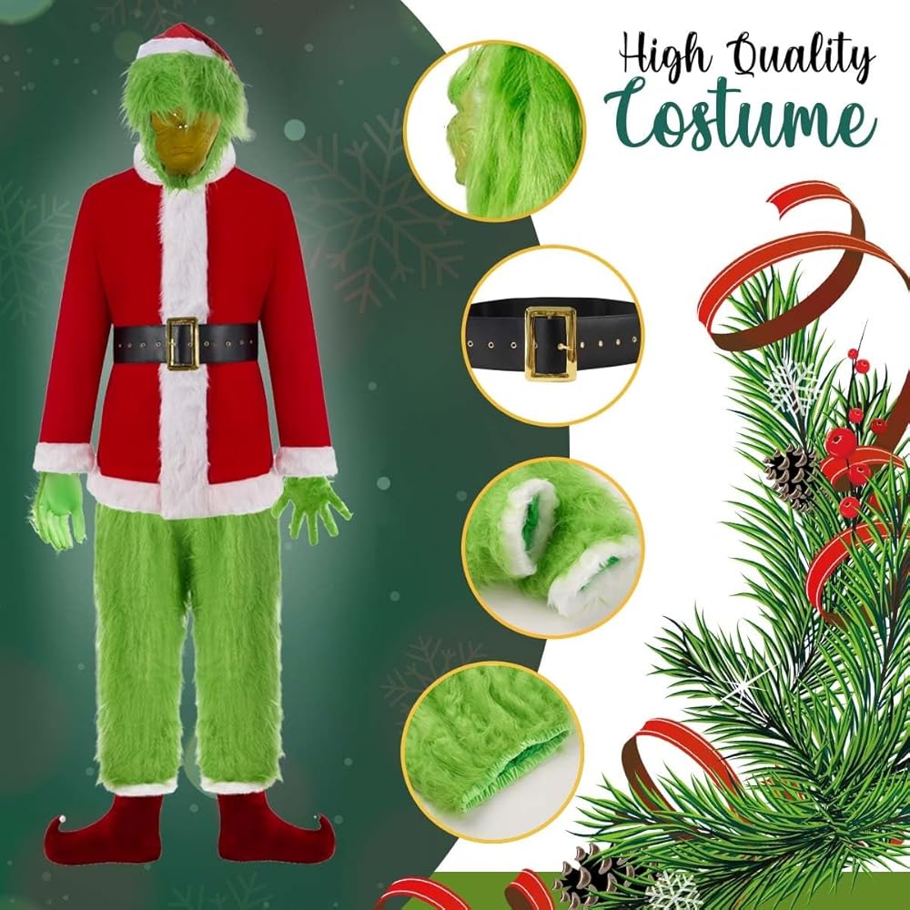 • PREMIUN QUALITY MATERIAL - Full set of our santa costume is made of good quality material, non-toxic latex made full mask, fuzzy green gloves and furry comfortable pants, all these combine our 7PCS costume set; It's cosplay costume but quality can compare favorable with your daily apparel and you can use it year by year.