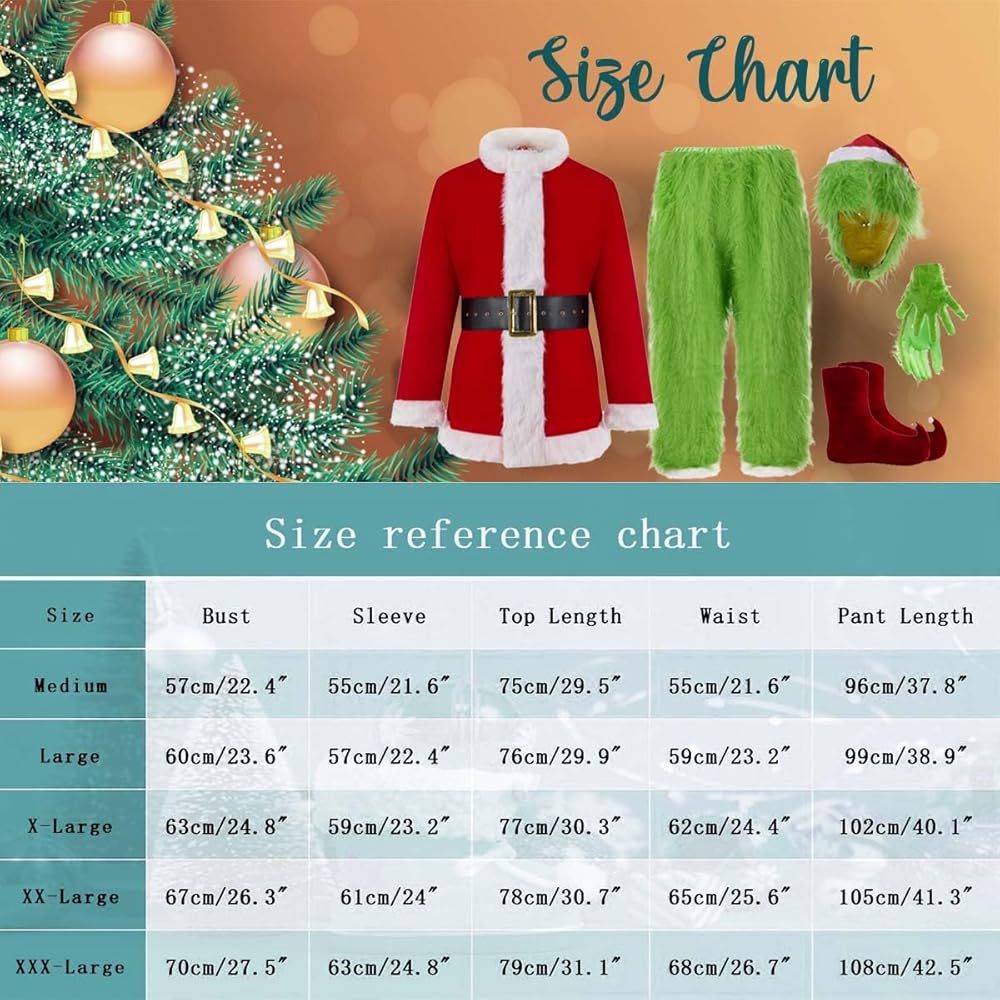 Santa Claus Costume For Men - 7PCS Adult Christmas Santa Suit Set Green Monster Outfit (Including Mask)