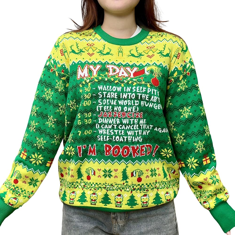 Celebrate the season with our My Day I'm Booked xmas ugly apparel, a thoughtful gift for adults. Made from acrylic material, it offers a soft, comfortable fit and is easy to care for - simply machine wash inside-out and hand wash. Available in various sizes, this humorous Christmas sweater adds festive fun to your holiday wardrobe.