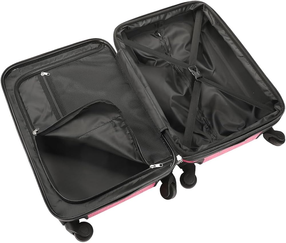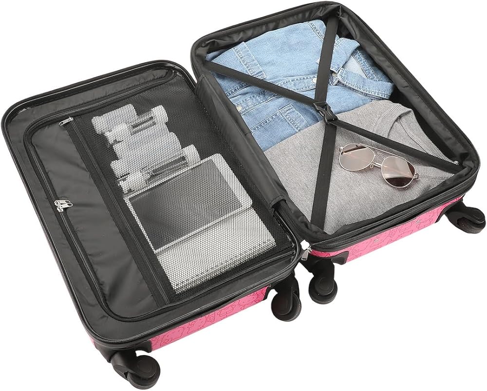 Travel in sweet style with this pink Hello Kitty hard-shell luggage. Featuring an image of Hello Kitty sitting front and center, this case adds a touch of charm to every journey. The retractable trolley handle and four wheels ensure smooth maneuverability, while the interior includes cross straps and a zippered divider panel to keep items organized. Built with durable ABS and PC film materials, it expands for extra space and wipes clean for easy care.