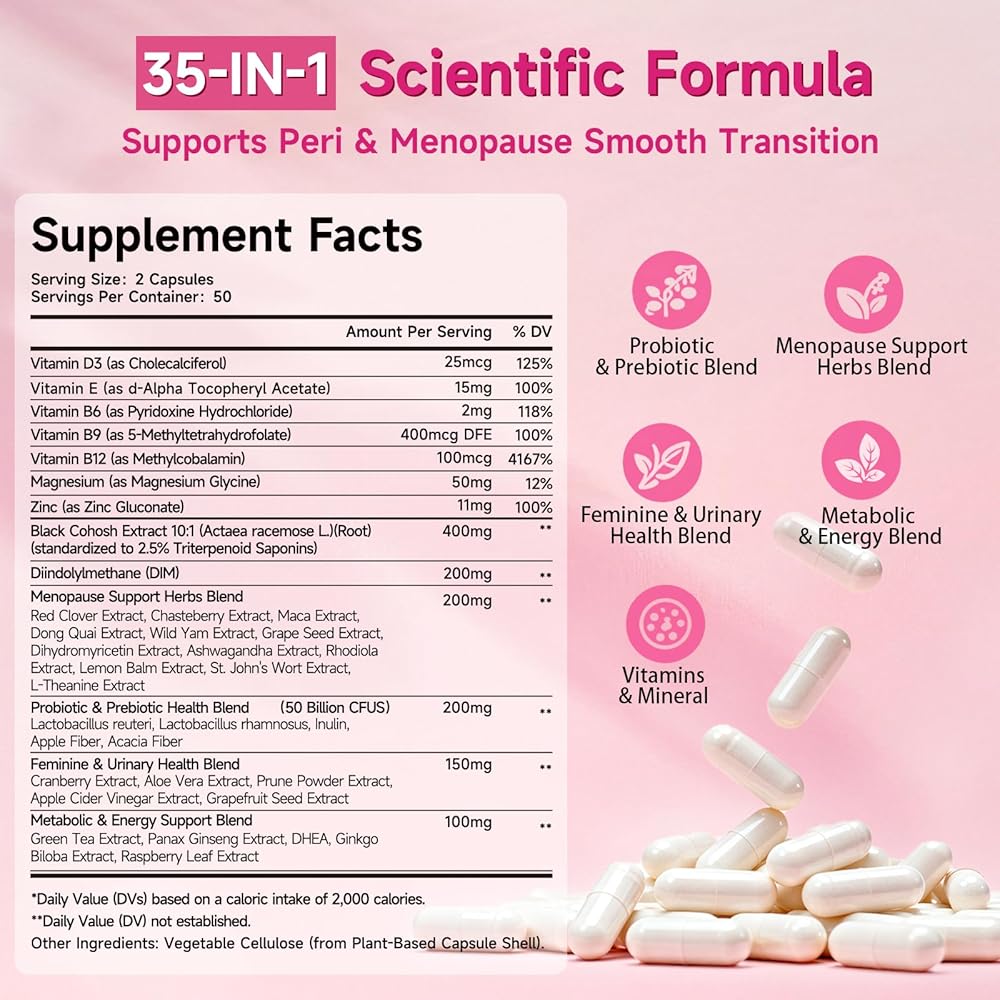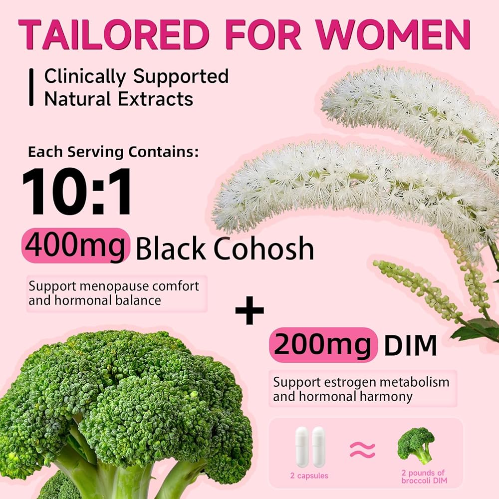 • 【تركيبة متميزة】تحتوي كل جرعة على 400 مجم 10:1 كوهوش أسود و200 مجم DIM. ممزوجًا بمركب عشبي لانقطاع الطمث، والبروبيوتيك والبريبايوتكس، ودعم المسالك البولية والحميمية، ومجمع التمثيل الغذائي والطاقة، بالإضافة إلى الفيتامينات والمعادن الأساسية. توفر كبسولتان فقط رعاية شاملة - دون الحاجة إلى زجاجات متعددة - مما يجعل من السهل مواجهة التحديات المتعددة لانقطاع الطمث.