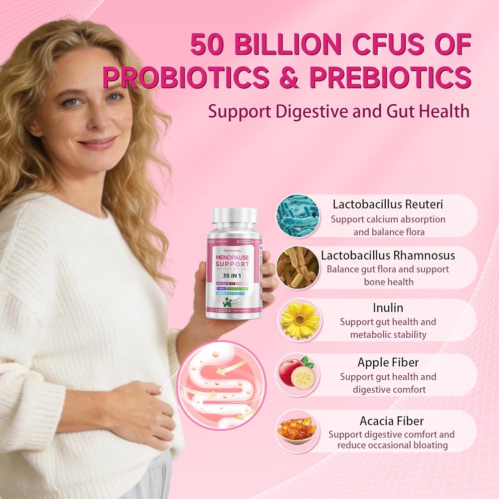 • 【صحة الأمعاء والمهبل 】 50 مليار بروبيوتيك CFU بما في ذلك Lactobacillus reuteri و Lactobacillus rhamnosus، بالإضافة إلى البريبايوتك Inulin وألياف التفاح وألياف السنط، توازن بلطف ميكروبات الأمعاء وتدعم صحة المهبل. مثالي لمكملات فترة ما قبل انقطاع الطمث للنساء اللاتي يبحثن عن الراحة اليومية.