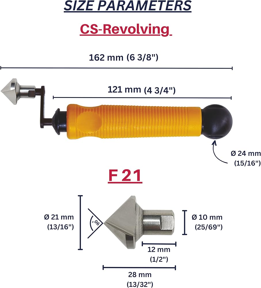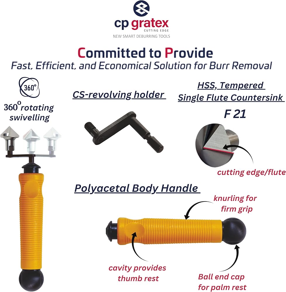 مجموعة مشطوفة من سي بي جرات.اي اكس - اداة دوارة وشطب وتمزيق المعادن والخشب والبلاستيك للثقوب من قطر 2.5 ملم (3/32 انش) الى Ø19 ملم (3/4 انش) - شفرة 90 درجة، طرف مدبب، مع حامل دوار ومقبض