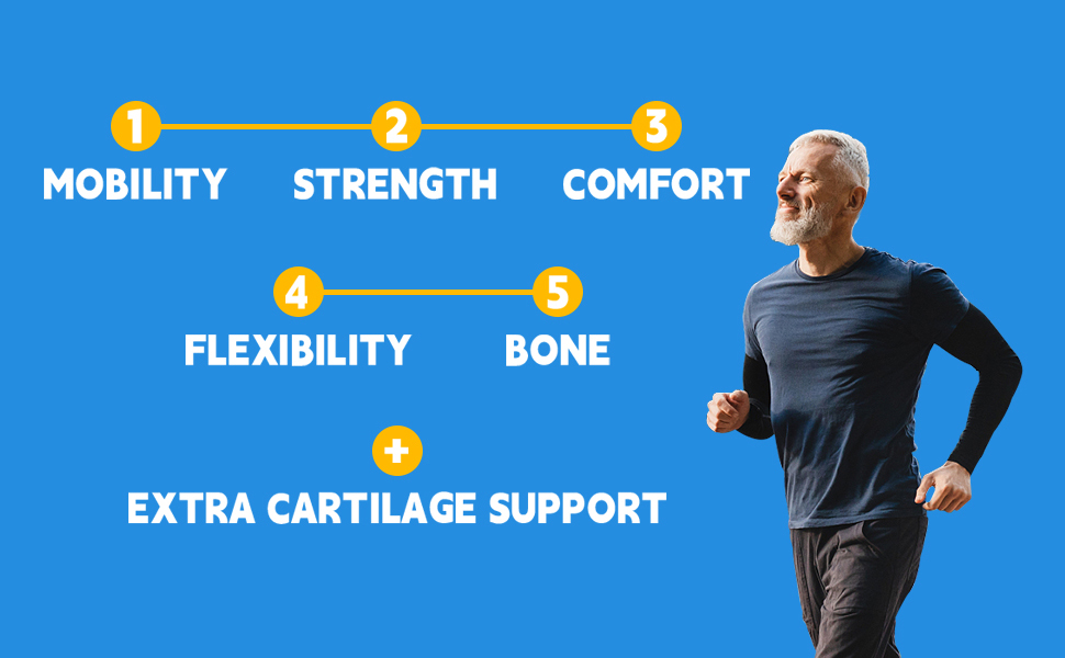 مكمل دعم المفاصل الكل في واحد - استبدل زجاجات متعددة من مكملات الكوندرويتين والجلوكوزامين الغذائية بمكمل مشترك شامل واحد. يوفر لك مزيجًا مثاليًا من المكملات الغذائية القوية التي ستساعدك في الحفاظ على صحة مفاصلك ودعمها طوال حياتك النشطة.