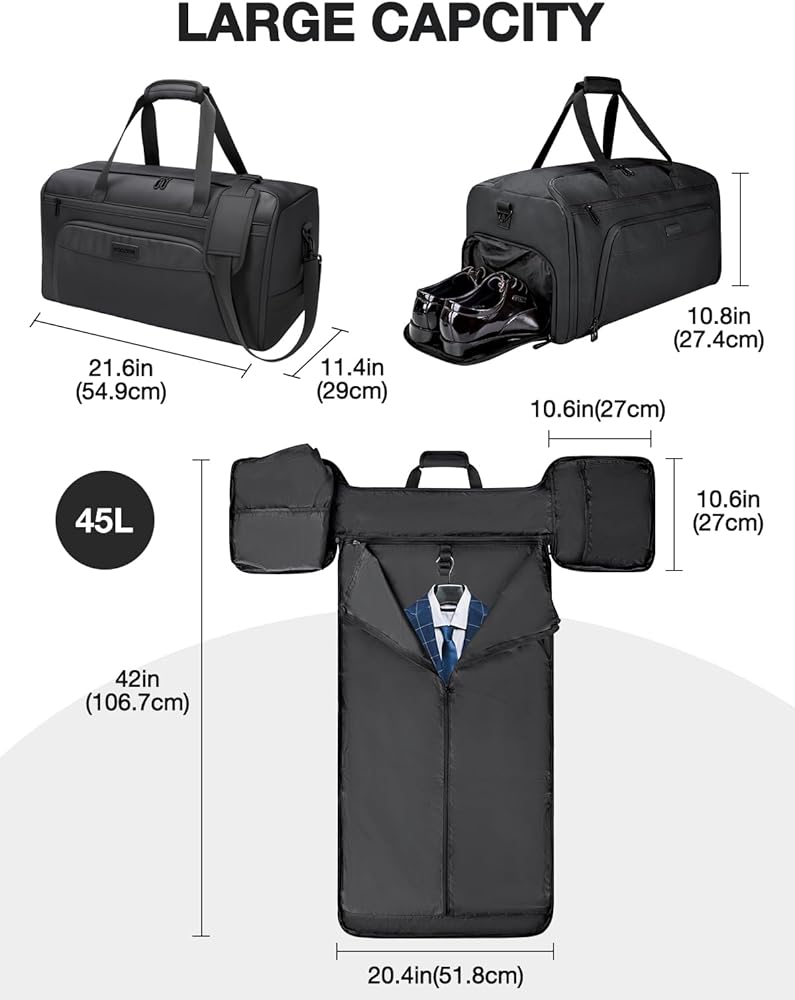 3 IN 1 CONVERTIBLE GARMENT BAG: The Convertible Garment Bag combines the functionality of a garment bag, duffle bag, and backpack. It allows you to hang suits and clothes for travel, while easily converting into a backpack for hands-free convenience. Ideal for business trips or weekend getaways, this all-in-one design offers both style and practicality
