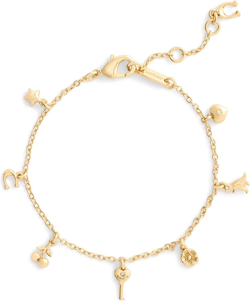 Refined chain link bracelet featuring iconic mini charms including signature sculpted C, Rexy dino, tea rose, cherry and key perfect for everyday. Bracelet has an adjustable lobster clasp closure. Made from brass and glass crystal. Includes signature COACH jewelry dustbag.