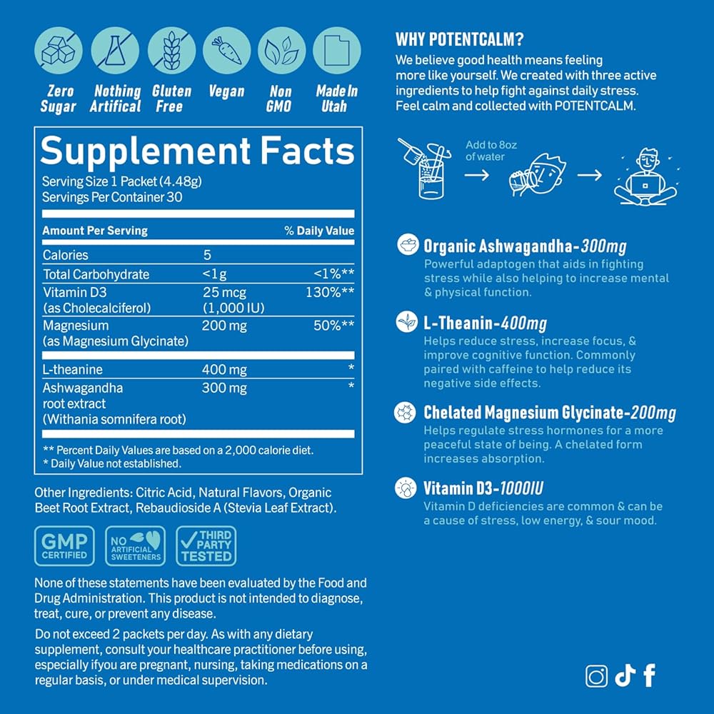 • 【مكافحة الإجهاد، وتجديد الشباب】: يساعد مسحوق PotentCalm في إدارة التوتر وتخفيف التوتر وتهدئة عقلك للحصول على تجربة مهدئة. علاوة على ذلك، يساعد مزيج المشروب المصمم بخبرة على تعزيز تركيزك وعافيتك بشكل عام، مما يريح عقلك ويصرفه عن المخاوف التي قد تبقيك مستيقظًا.​