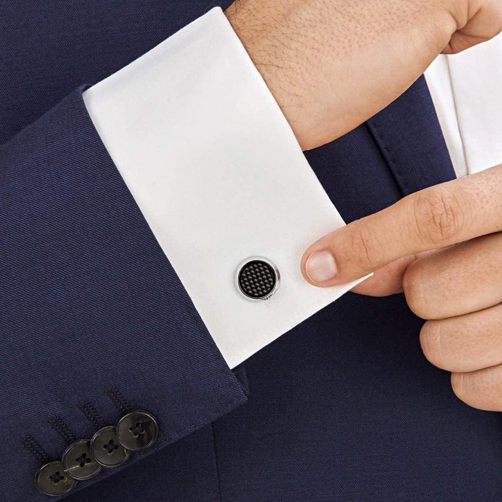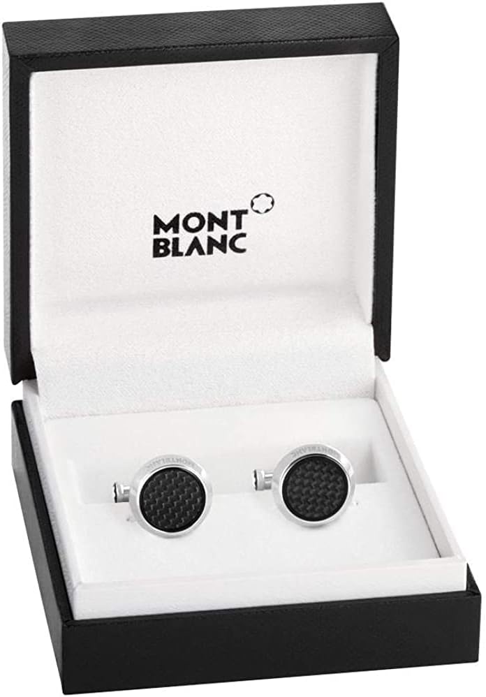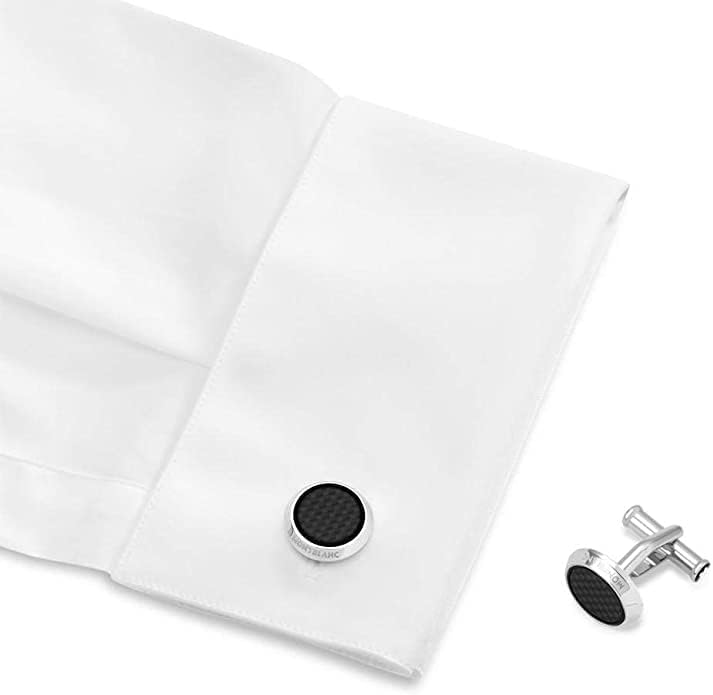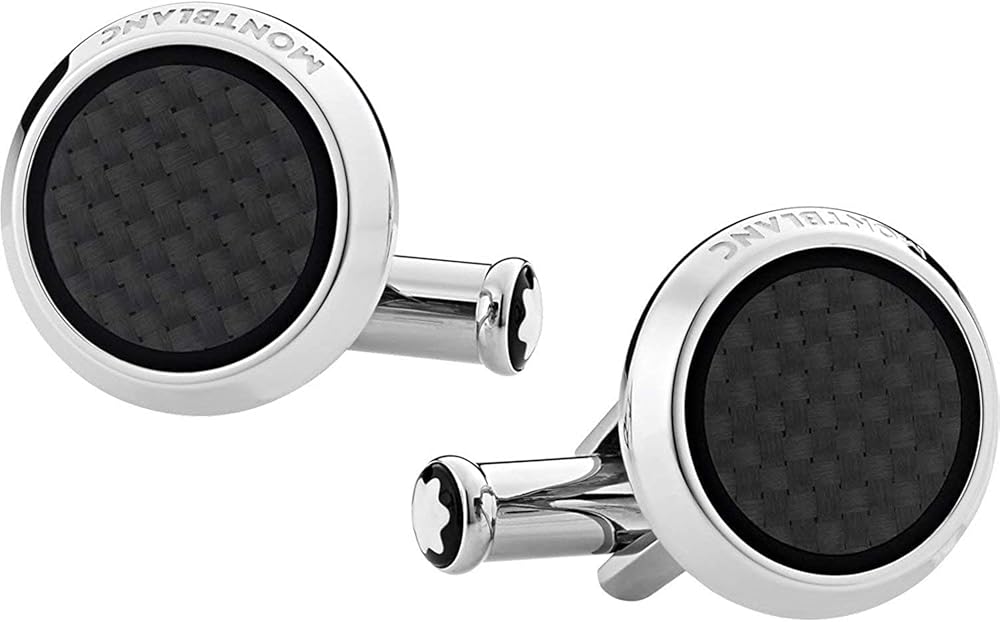 Montblanc Men's Cufflinks. Extreme 2.0 series. SKU: 124295. Color: Silver/Black. Metal Type: Stainless Steel. Carbon-patterned inlay. Montblanc logo at the bottom. Montblanc Extreme 2.0 Men's Stainless Steel Silver/Black Cufflink.