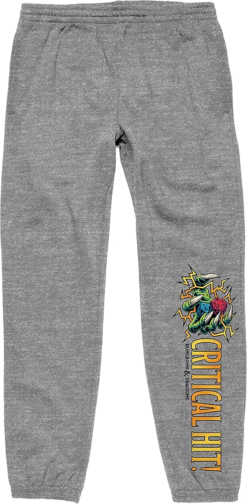 Join a comfy campaign with these Dungeons & Dragons sweatpants. The pants feature a green hand from a creature rolling a pair of red dice. Sideways yellow letters below the image spell out the game's title. The pants come in athletic heather and are equipped with a pair of pockets. Enjoy the comfy feel of these pants as you play the game with friends.