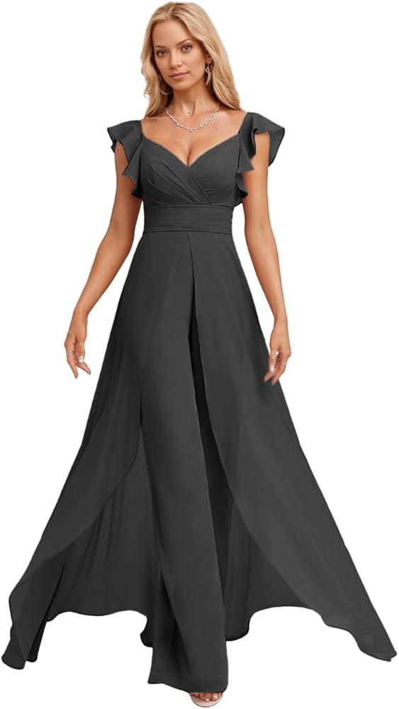 Ruffle Chiffon Bridesmaid Jumpsuits with Slit Pleated V Neck Wedding Guest Pantsuits Product Details: Fabric:Chiffon Neckline:V Neck Length:Floor Length Back Details:Zipper Back Reminder: 1. Due to the light, the color deviation of the monitor, and the individual's deviation in color understanding, there are differences between the actual product and the picture. This is not a product quality issue, please refer to the actual product. 2. There may be a small amount of error in manual measurement, please refer to the actual product.