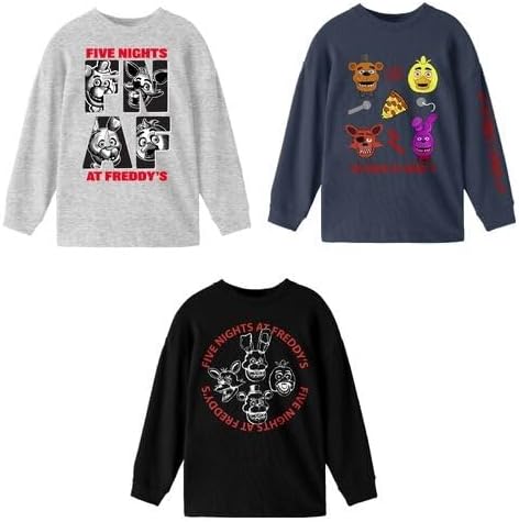 Bring a spooky touch to his wardrobe with this boy's 3-pack Five Nights at Freddy's crew neck long sleeve shirt set. Featuring an athletic heather tee with black and white character art and red title text, a navy tee with character heads, and a black tee with the characters in a circle surrounded by red text, this set delivers bold gaming flair. Each shirt is crafted from a 50% cotton and 50% polyester blend for comfort and durability. Machine wash them on cold with like colors and tumble dry on low heat. Use only non-chlorine bleach when needed. Do not iron or dry clean.