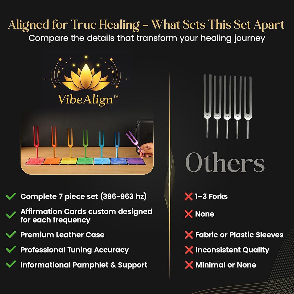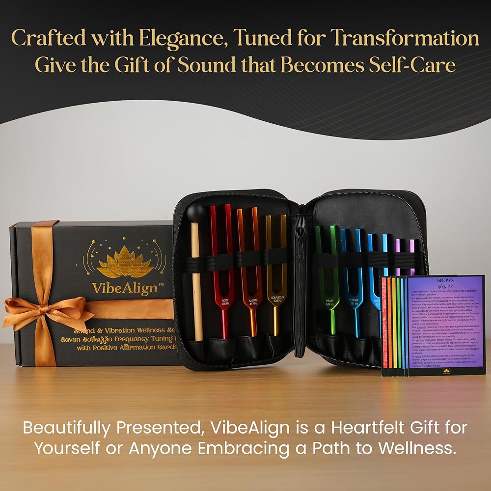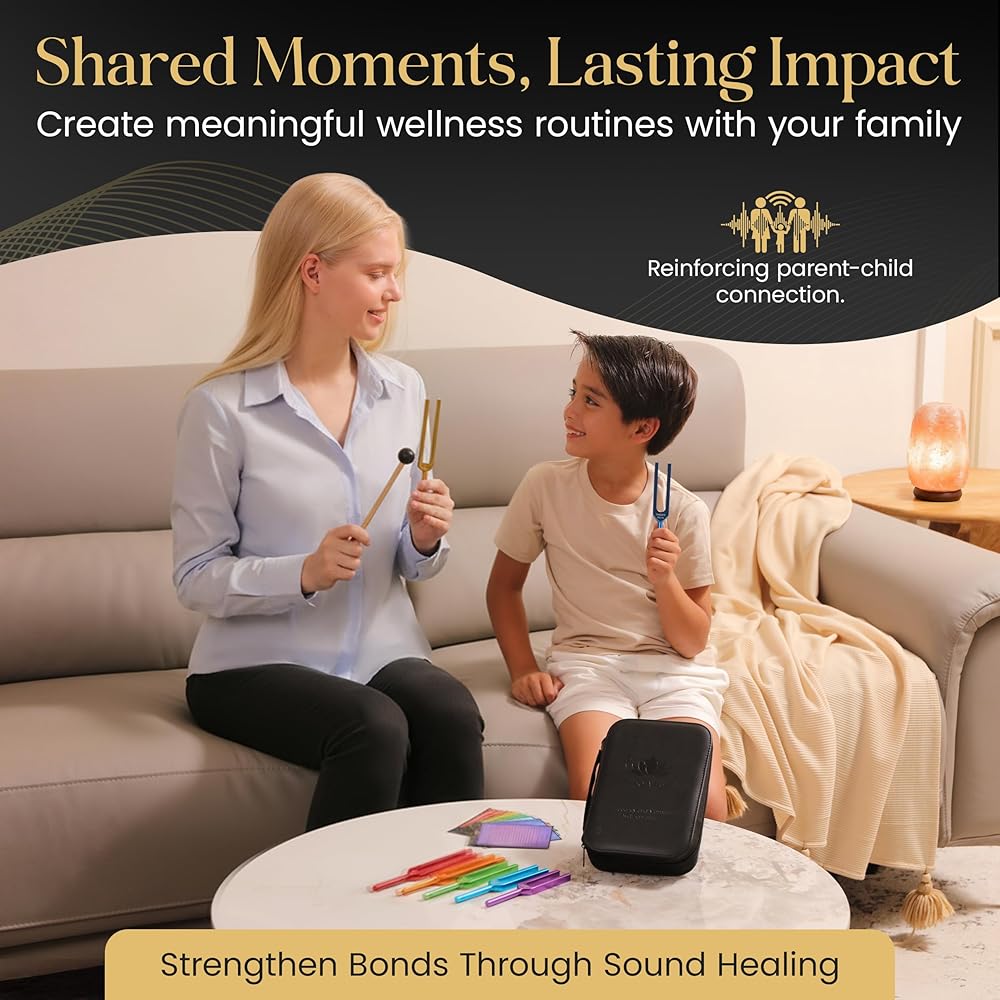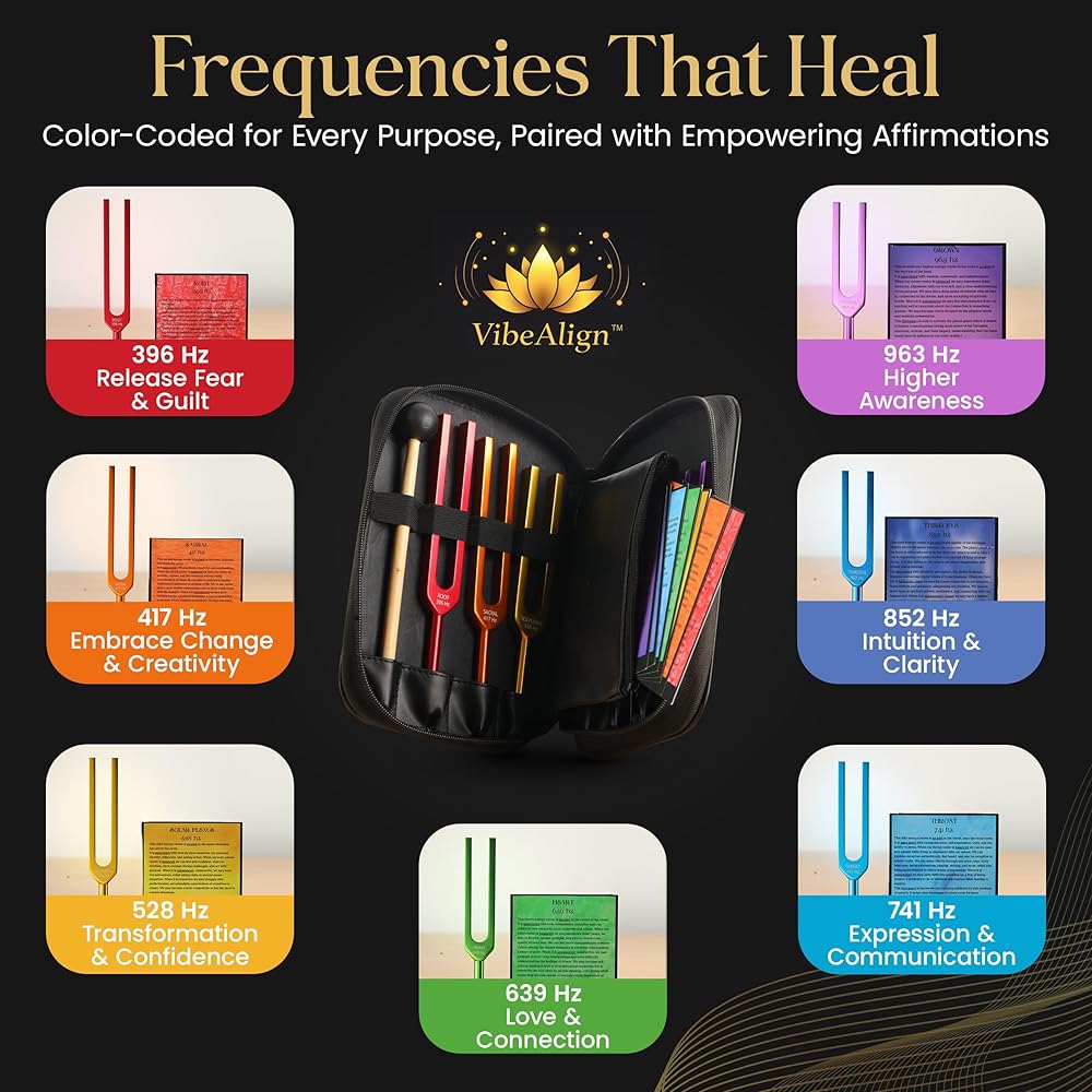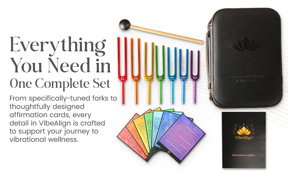التأكيد والتردد - يتم إقران كل شوكة رنانة ببطاقة تأكيد إيجابية مطابقة لتضخيم التوازن العاطفي، والعقلية الإيجابية، وتعزيز الاتصال مع الذات. مزيج قوي من الصوت والتأكيد للتحول الشخصي والمواءمة.