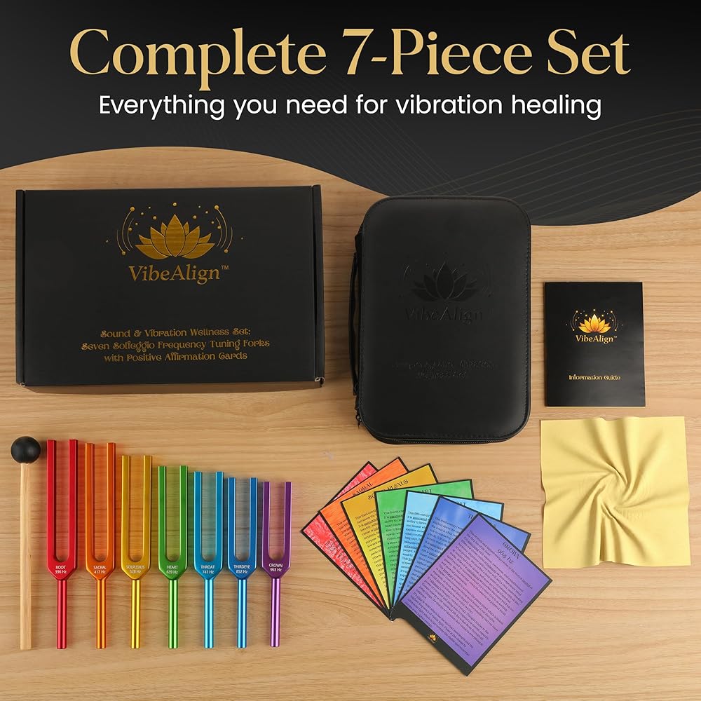 مجموعة شوكات ضبط مع بطاقات تأكيد إيجابية للاهتزاز وعافية التردد - 7 قطع من أدوات صوت مرمزة بالألوان لترددات سولفيجيو مع حقيبة واقية، ومطرقة، وقماش، ودليل.