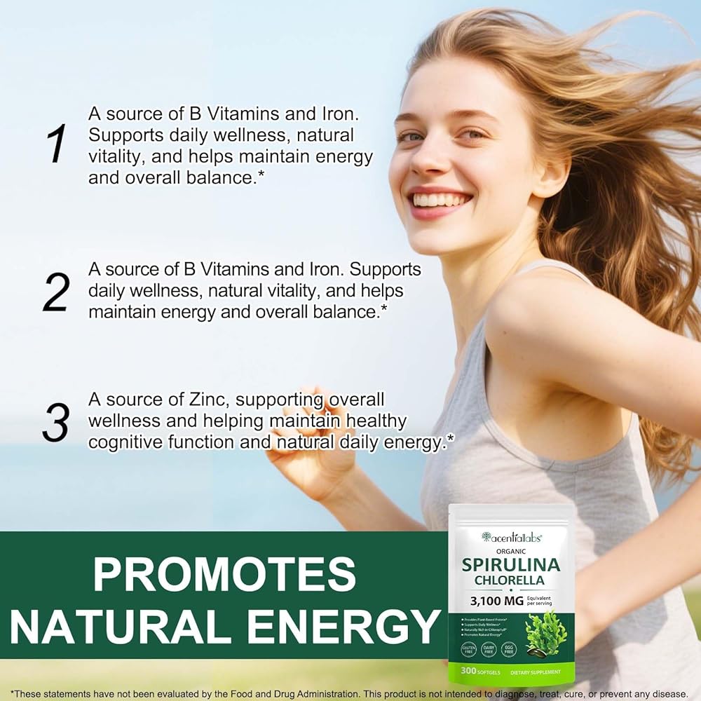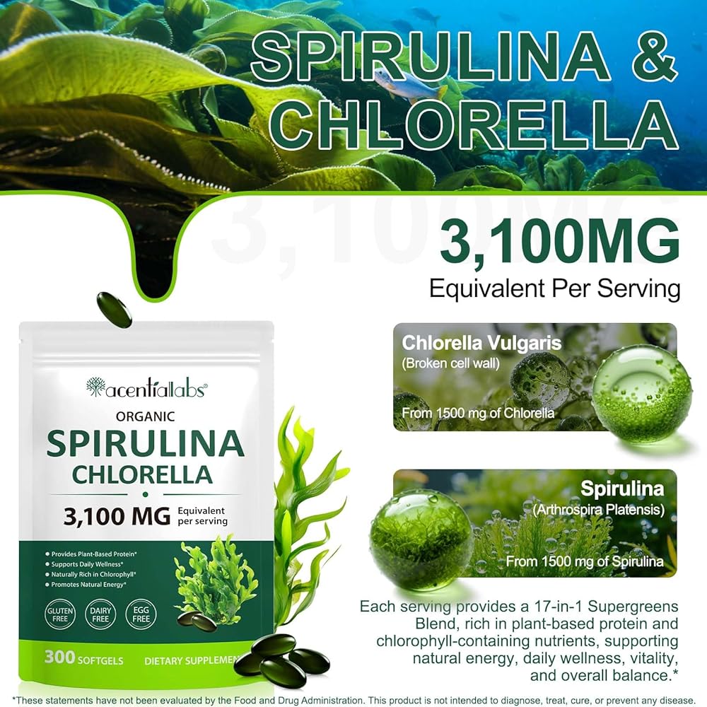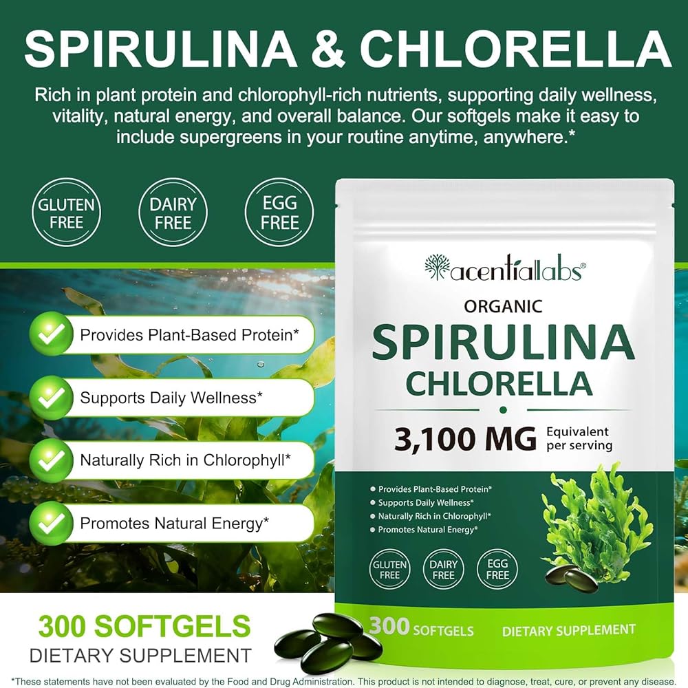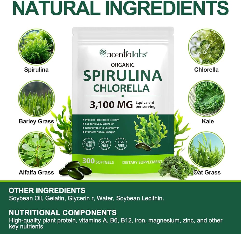 Each serving (3 softgels) contains 3,100 mg of organic spirulina and chlorella, which work together to provide natural energy, support a healthy metabolism, and promote physical wellness. This blend is also naturally rich in chlorophyll, known for its ability to maintain a healthy balance and vitality.