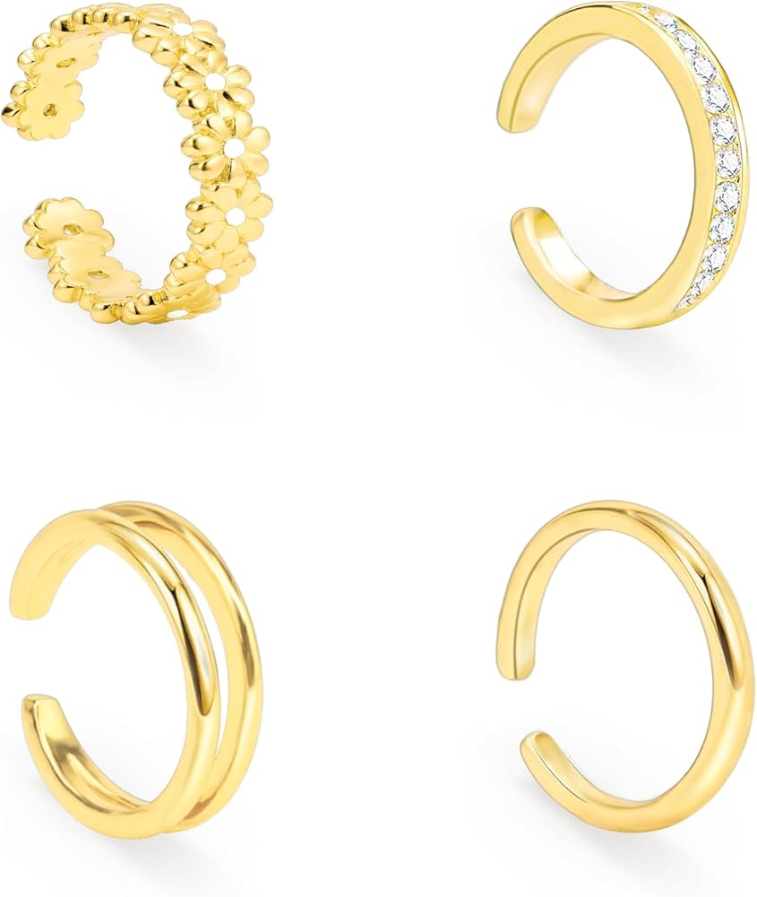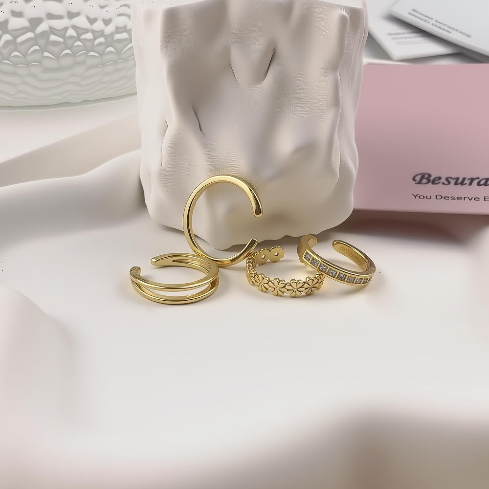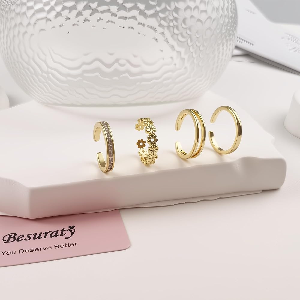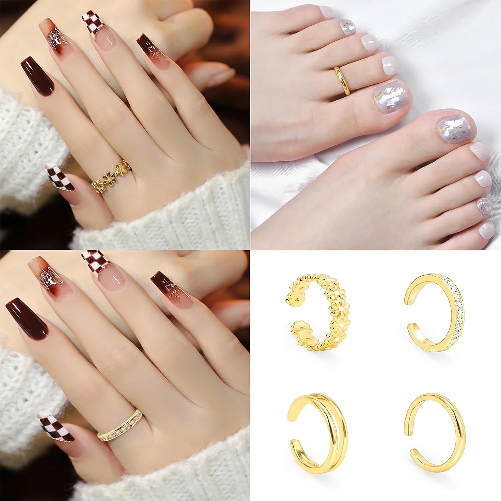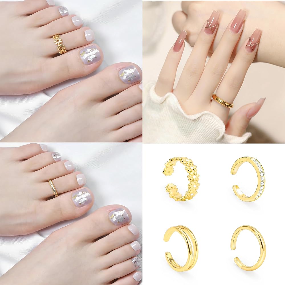 Gold Toe Rings for Women - Package includes 4 pcs adjustable toe rings, flower toe ring, CZ toe ring, double row toe ring, simple band toe ring, they're open on the backside so you can adjust the size to fit chubby toes or slimmer toes.