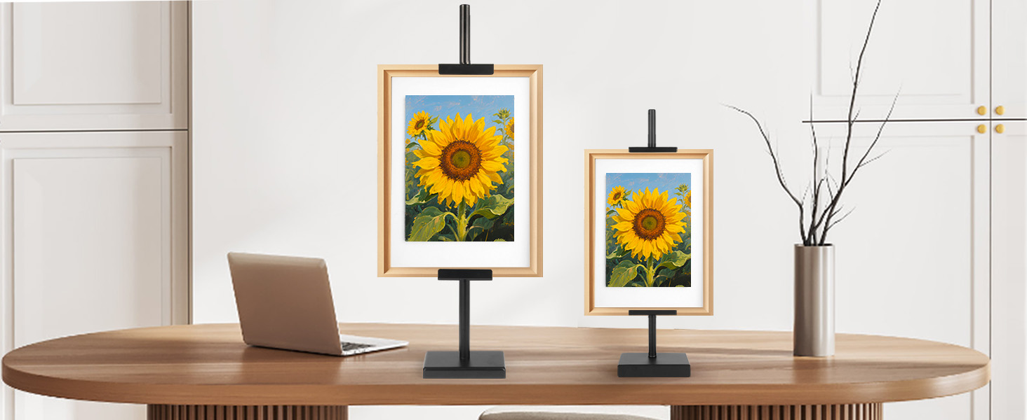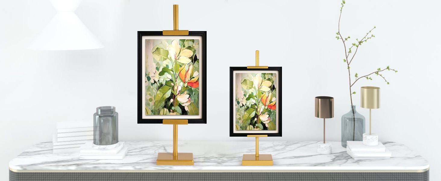 【تصميم عصري】يتميز حامل إطار الصور الذهبي الخاص بنا بمظهر أنيق وراقي يكمل أي ديكور مكتب أو منزل، مما يجعله خيارًا مثاليًا لغرف المعيشة والمكاتب والاستوديوهات والمعارض والمعارض.