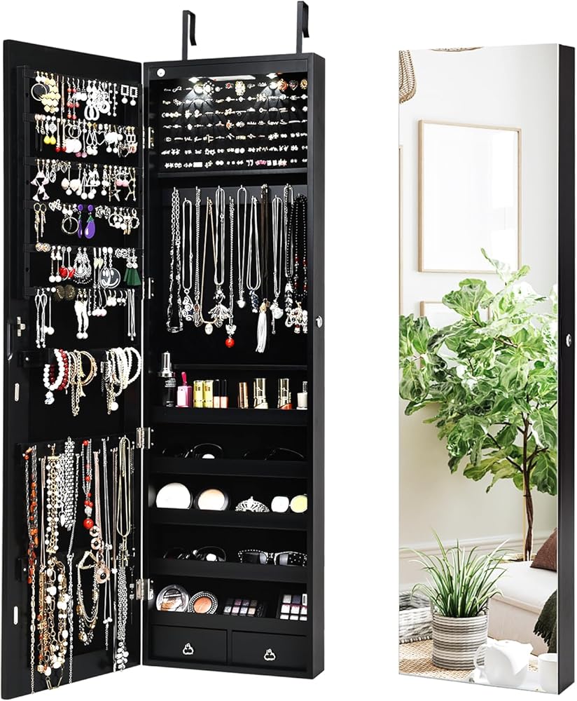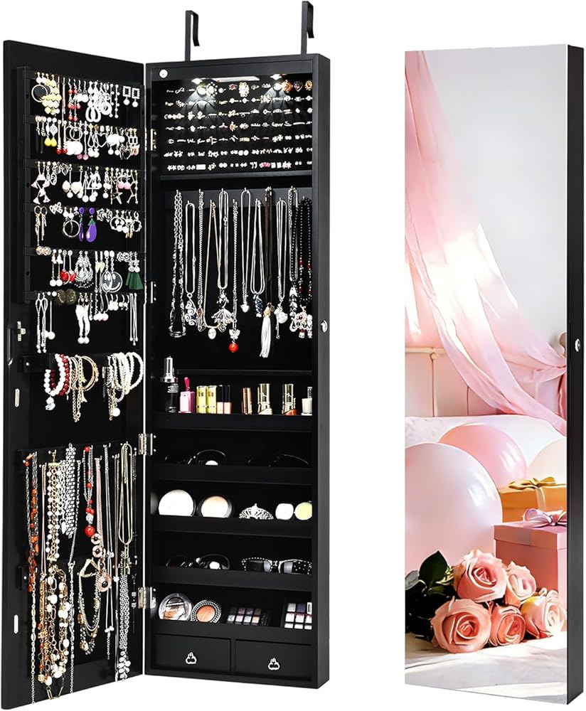 • حماية كنوزك ومجوهراتك: مكان يجعل مجوهراتك تشعر وكأنها في المنزل: من فضلك لا تترك مستحضرات التجميل والمجوهرات الخاصة بك في الأدراج أو تحت رحمة الغبار. تعرض خزانة مرآة المجوهرات هذه المجوهرات كما لو كانت في واجهة عرض، كما أن التصميم القابل للقفل المزود بمفتاحين يحميها من الغبار والأيدي المتطفلة. سوف يتألقون دائمًا في أرفف المجوهرات الآمنة والمتطورة هذه.