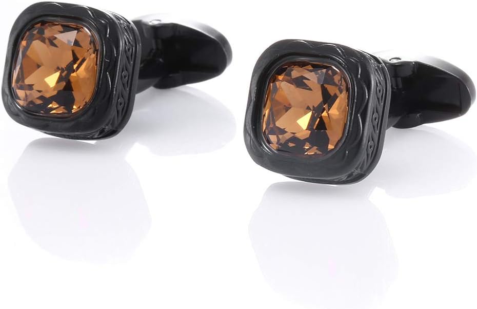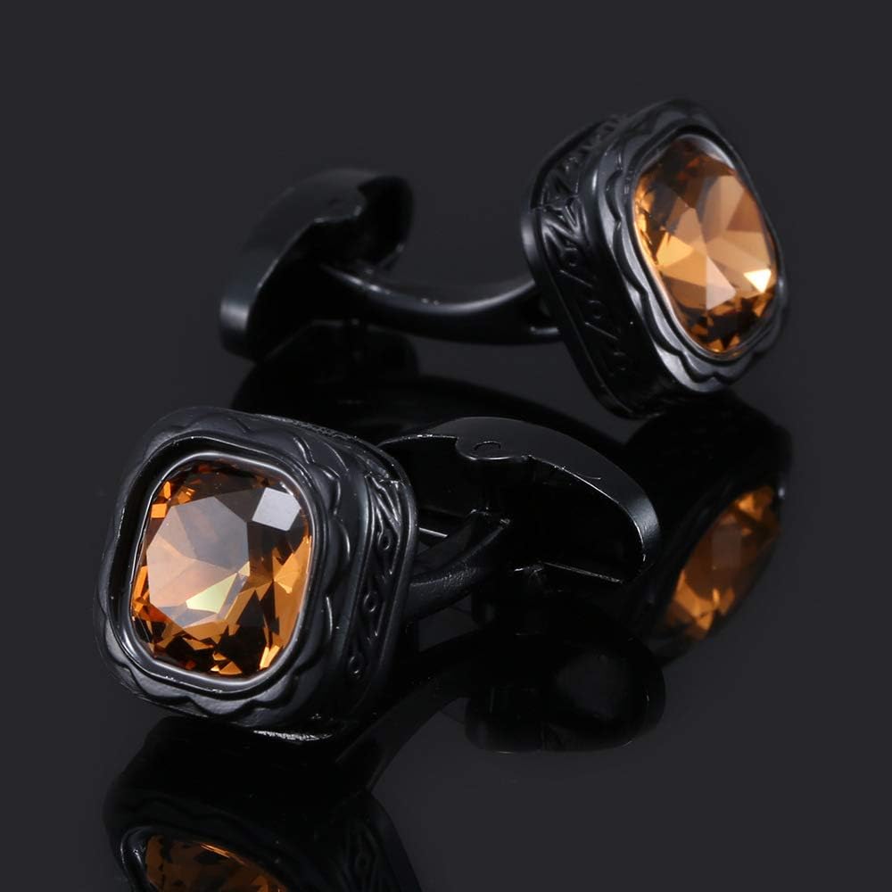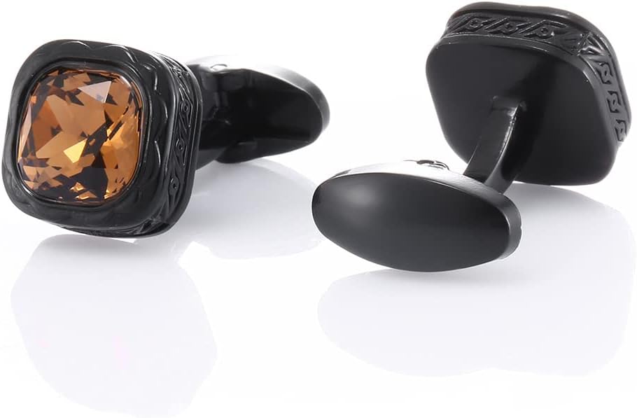Distinctive Design: These cufflinks feature a square shape with a warm amber crystal at the center, surrounded by sleek black stainless steel for a bold and elegant look.