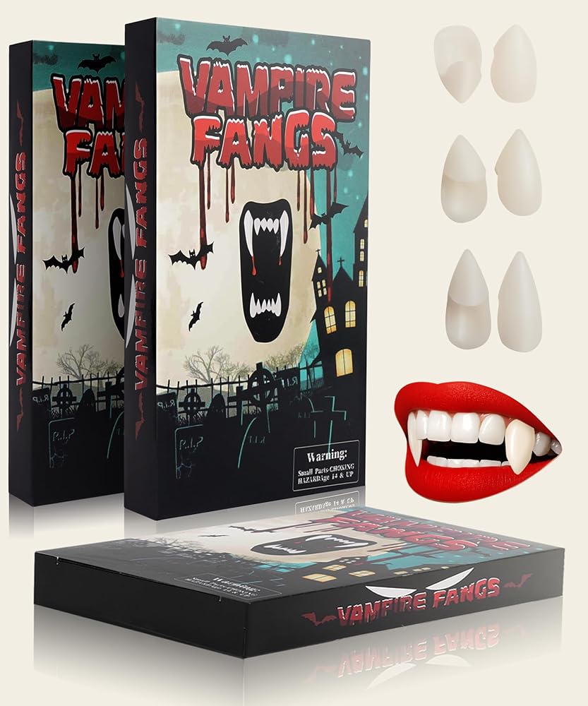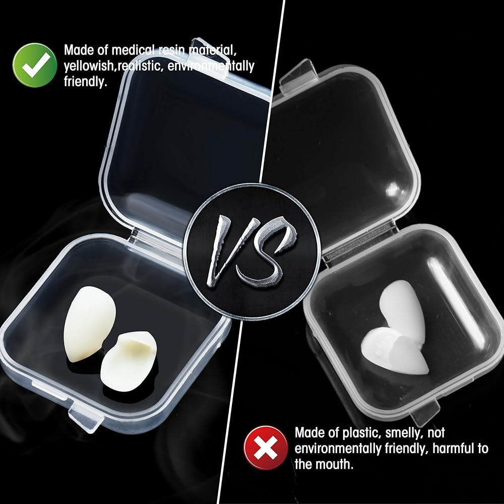 · التعبئة الفردية: يأتي كل زوج من أسنان مصاصي الدماء مع صندوق صغير يسهل حمله وتخزينه. وهذا يضمن أيضًا أن أنياب مصاصي الدماء قابلة لإعادة الاستخدام.