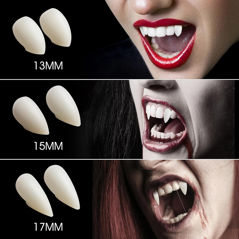 · أسنان مصاصي الدماء بثلاثة أحجام: أنياب مصاصي الدماء للبالغين لها ثلاثة أحجام مختلفة 13، 15، 17 ملم، وهي مناسبة للأشخاص من جميع الأعمار لاستخدامها في مصاصي الدماء في الهالوين وغيرهم من لعب الأدوار.