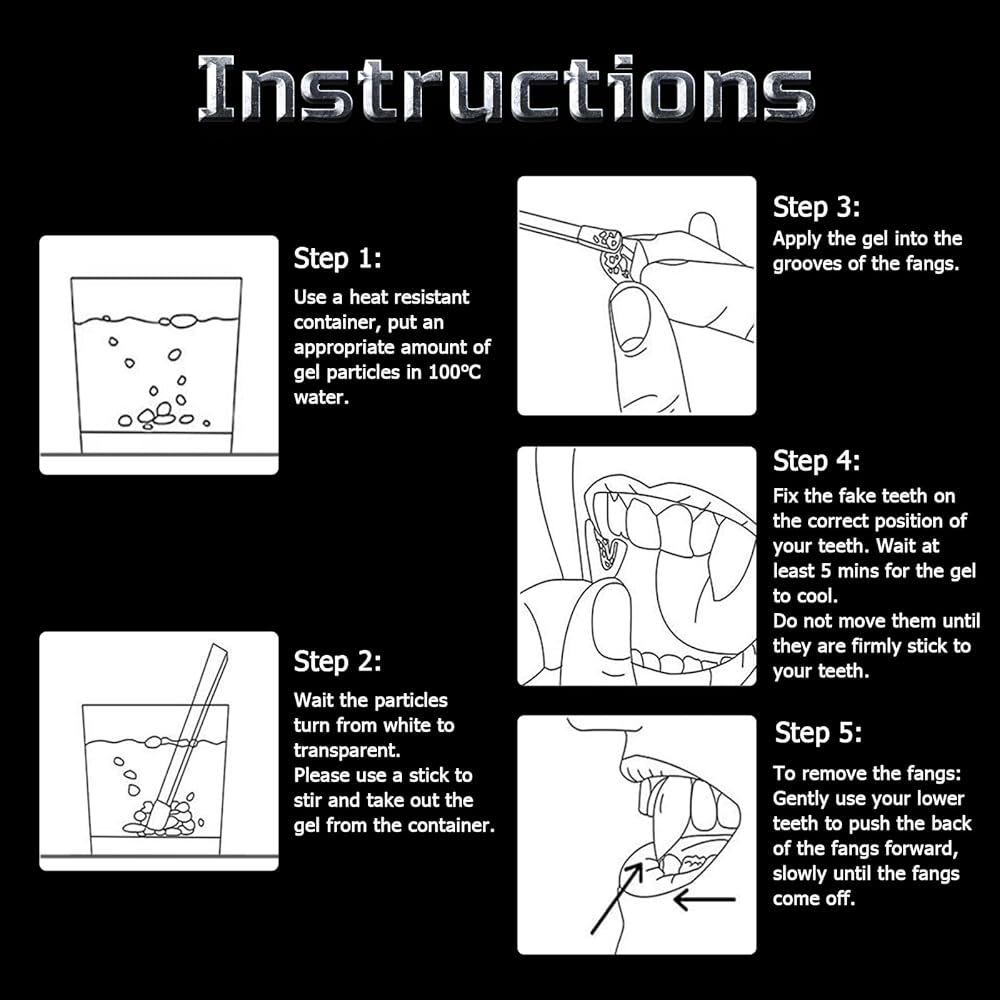 ·ارتداء أنياب مصاصي الدماء 1. قبل الارتداء، يرجى مسح سطح الأسنان بمنديل للحفاظ على سطح الأسنان جافًا. 2. أثناء الاستخدام، يرجى عدم لمس الأنياب بشفتيك ولسانك. (من فضلك لا تهز أنياب مصاص الدماء.) 3. كرر الخطوات المذكورة أعلاه لارتداء أنياب مصاص الدماء الثانية. (ملاحظة: بعد إزالة الجل من فرن الميكروويف، يجب أن تلتصق الأنياب بالأسنان خلال 20 ثانية، لأن الجل ستنخفض لزوجته عندما يبرد.) 4. إذا كانت أنياب مصاص الدماء غير لزجة أو تسقط أثناء الاستخدام، قم بإعادة تسخين الجل وإعادة تثبيت الأنياب. الجل قابل لإعادة التدوير.