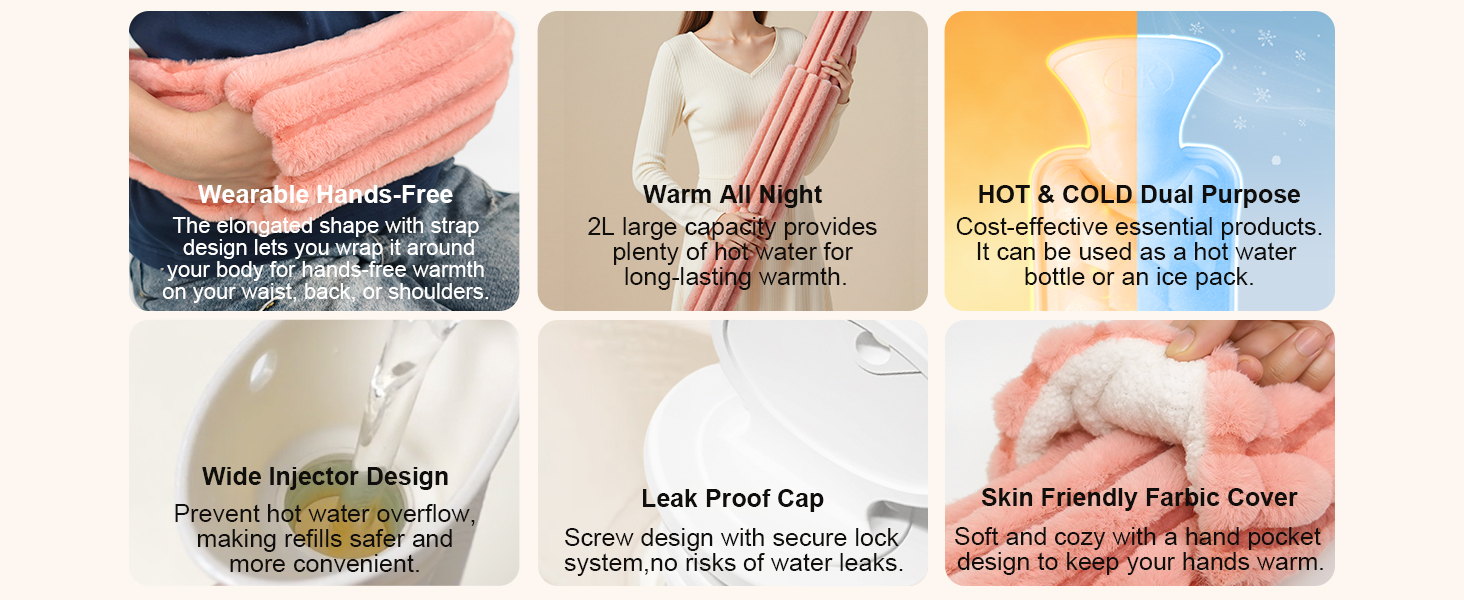 [عملية متعددة السيناريوهات] - أكياس الماء الساخن الممتدة والقابلة للتوسيع لها استخدامات عديدة. يمكن استخدامه للتدفئة ووضع كمادات ساخنة أو باردة على الرقبة والكتفين والخصر والبطن والذراعين ومناطق أخرى. بالإضافة إلى ذلك، أضفنا موضعًا لتدفئة اليد خصيصًا على الطبقة الخارجية. يمكنك استخدامه لتدفئة يديك، وإضافة أشرطة في نهاية المنتج لسهولة التثبيت. سواء كنت في المنزل أو ذاهبًا إلى العمل، فهذا منتج مفيد جدًا.