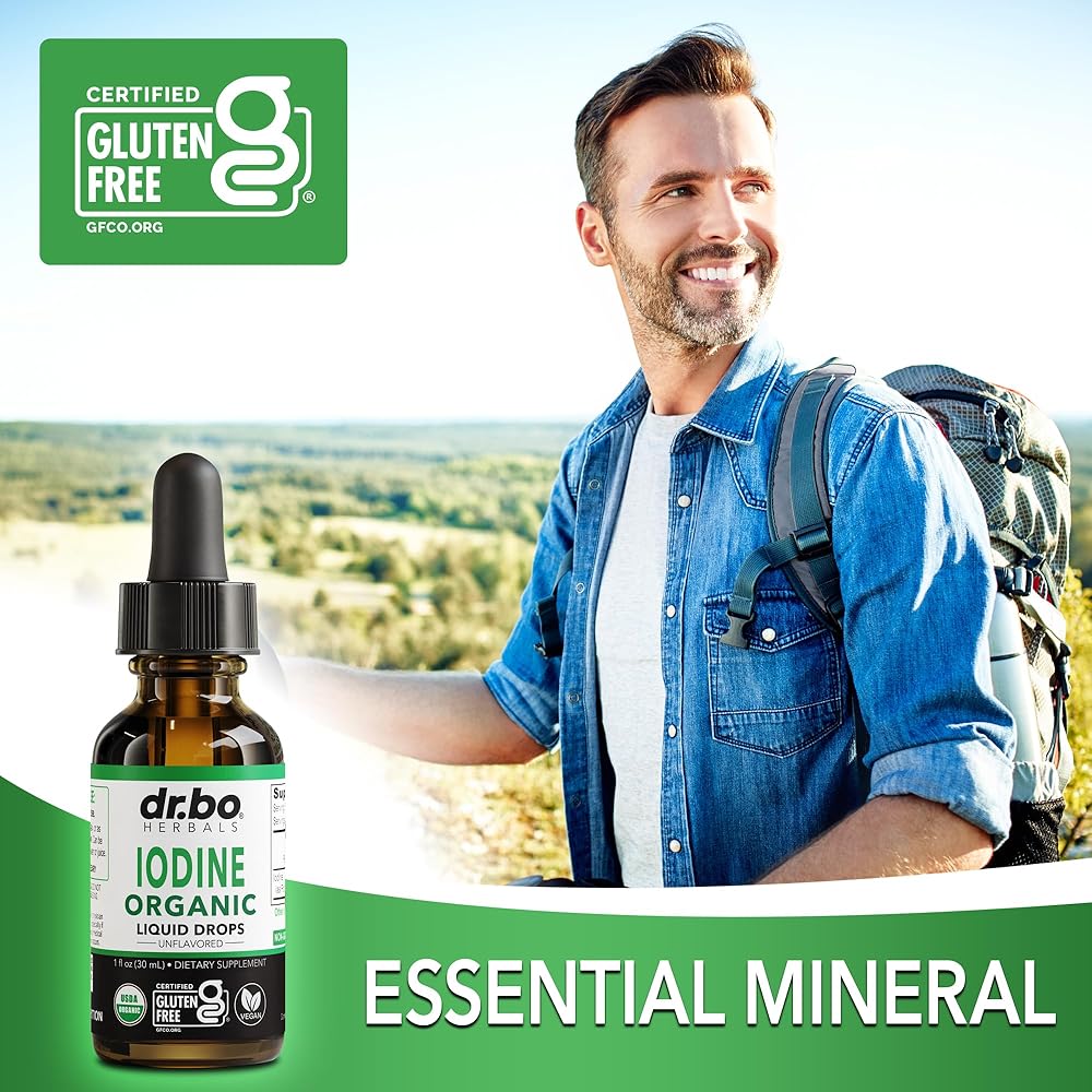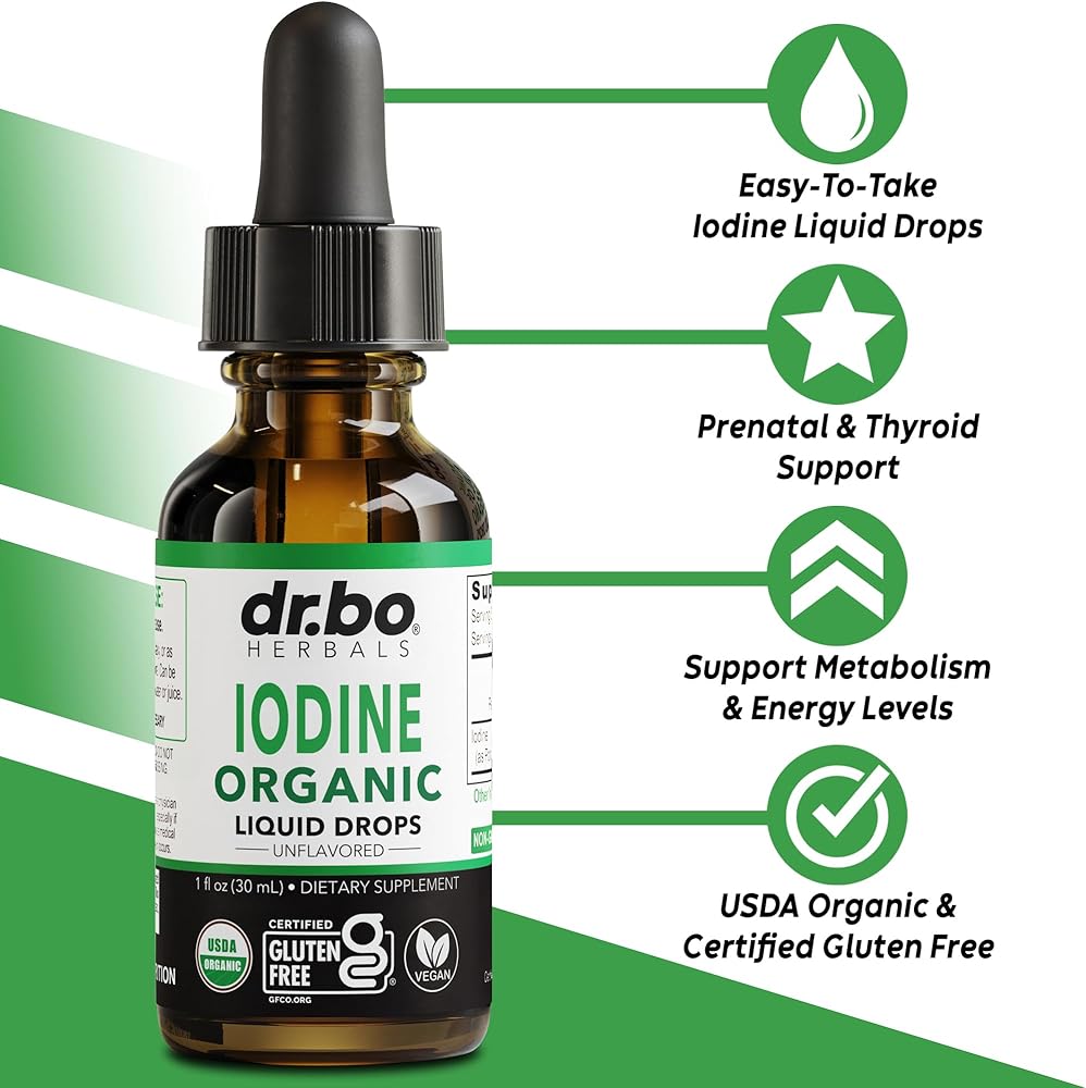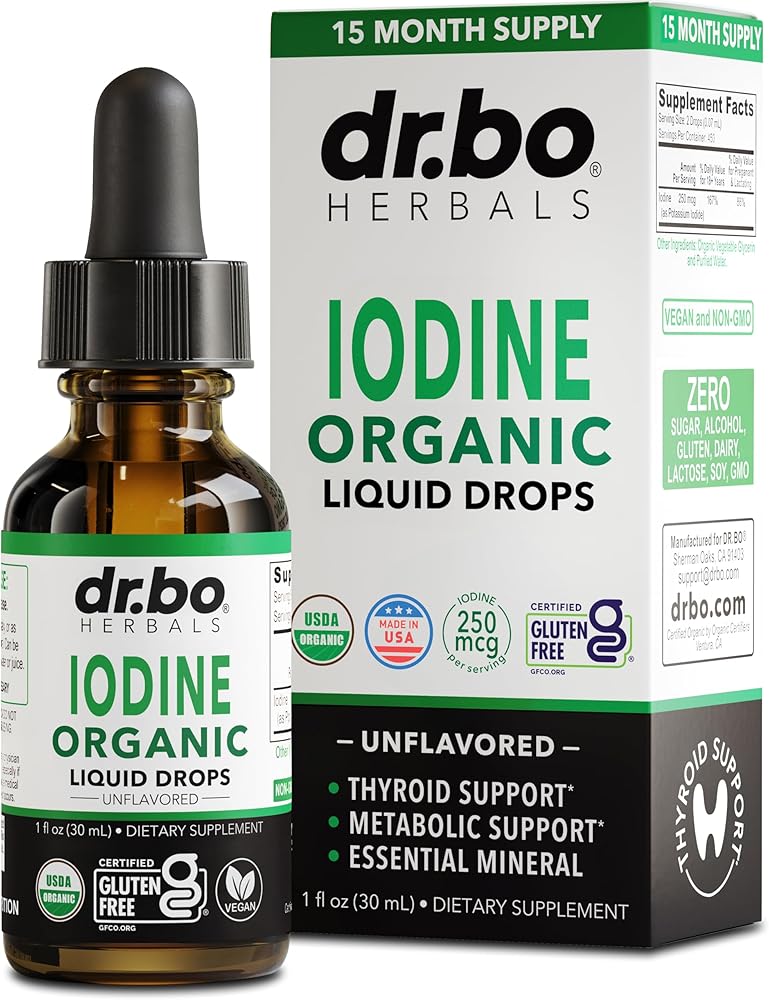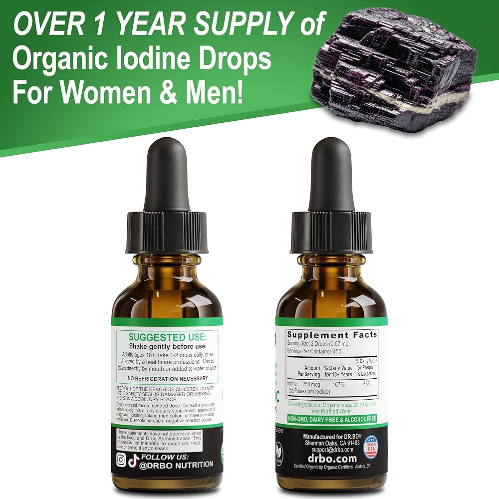 Need a pure organic clear iodine liquid drops supplement tincture for thyroid support? Try concentrated organic potassium iodide liquid drops tincture supplements to support immune health, skin hair, nails & iodine deficiencies. Natural liquid iodine drops for women, men, adults, kids & baby. Easy to take Dr Bo organic iodine drops tincture concentrate for thyroid support. Organic iodine tincture, no capsules, pills or gummies. Daily thyroid & immune support for adults & kids. Clear iodine liquid drops for organic thyroid support. Over 1 year supply with 2 drops of 450 servings! Support iodine deficiencies daily with pure organic iodine liquid drops supplement. Natural high-potency iodine for thyroid detox supplement health. Prenatal iodine drops supplement for women. Premium organic iodine supplement liquid for those on a vegan or vegetarian diet, plus those pregnant & nursing. Liquid iodine drops for thyroid & pregnancy support. USDA organic iodine clear supplements for men & women in an easy to take iodine liquid drops formula. Our Vegan, Non-GMO, pure iodine liquid tincture is USDA certified organic potassium iodide liquid drops. Natural premium clear iodine tincture liquid for women, men & kids. Easy to take unflavored iodine supplement & premium liquid iodine drops. A clear, tasteless organic iodine drops instead of pills or gummies. Support hair, skin & nails with liquid iodine drops supplement for women & men. Liquid iodine for thyroid health. A vital trace element for thyroid support iodine supplement liquid. 250 mcg iodine solution as Potassium Iodide to support energy, detox & stable metabolism iodine supplements for women & men. Dr. Bo organic iodine liquid drops for women, men, adults, kids & baby to support thyroid detox health. Organic potassium iodide liquid drops supplement for daily use. Our liquid iodine solution is an organic tincture of iodine for thyroid detox & support. Liquid iodine supplements for women support for iodine deficiency.