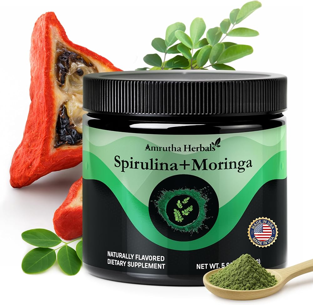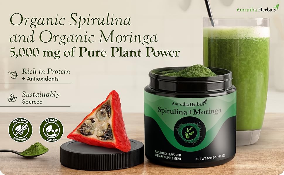 Amrutha Herbals Organic Spirulina + Organic Moringa Powder هو مزيج قوي من الأطعمة النباتية بنسبة 100٪ مصمم لتعزيز طاقتك، ودعم نظام المناعة الصحي، والمساعدة على الهضم، وتوفير دعم قوي مضاد للأكسدة.