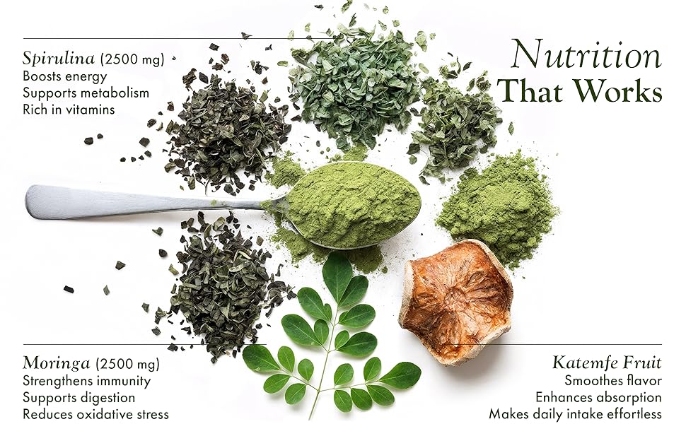 توفر كل ملعقة 2500 مجم من المورينجا العضوية (مورينجا أوليفيرا) و2500 مجم من سبيرولينا العضوية (أرثروسبيرا بلاتنسيس)، مع النكهات الطبيعية (مستخلص فاكهة كاتيمفي) للحصول على مذاق ترابي لطيف.