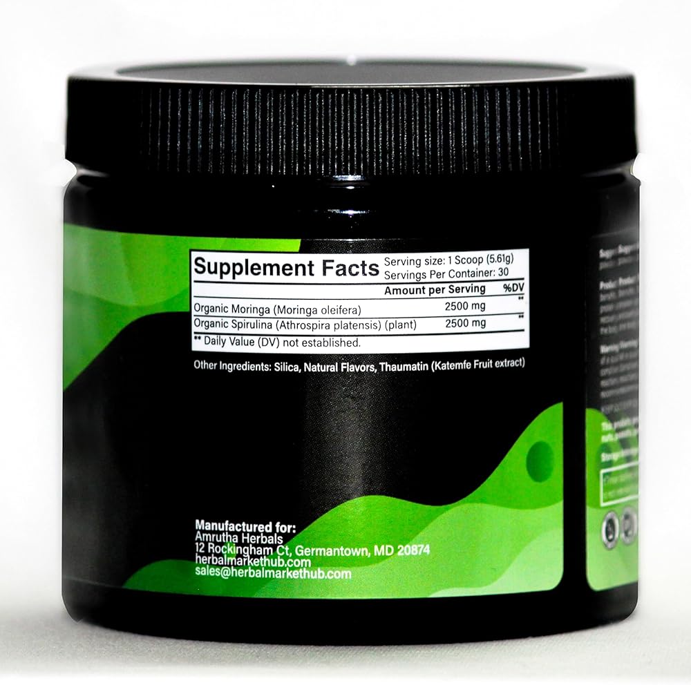 سبيرولينا عضوية + مسحوق المورينغا الأخضر العضوي، خالي من الغلوتين، صديق للنباتيين، التخلص من السموم والهضم، أطعمة فائقة الجودة 30 حصة مصنوعة في الولايات المتحدة الأمريكية