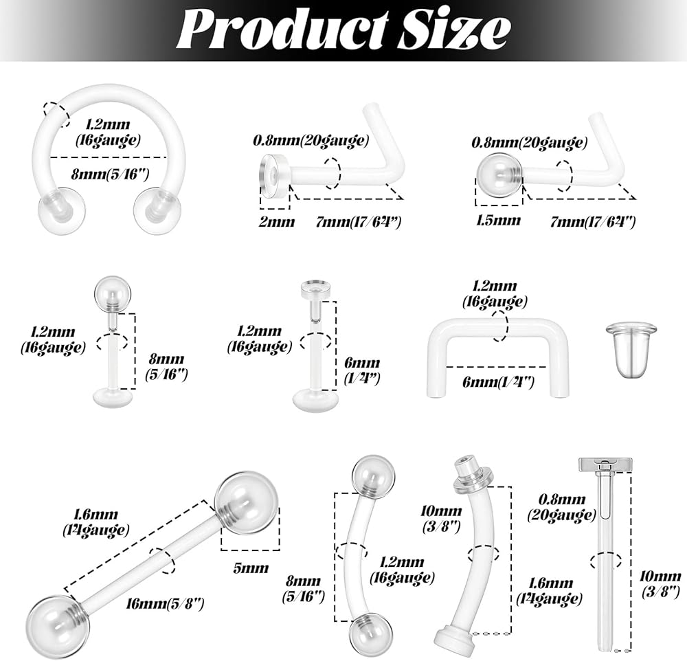 • Precise Measurements: Each piercing retainer comes with specific gauge sizes and lengths, including 16g (1.2mm) cartilage earrings at 8mm and 6mm lengths, 20g (0.8mm) nose studs at 7mm, plastic earlobe earrings at 10mm, and septum retainers available in 6mm and 8mm sizes, ensuring proper fit and comfort for various piercing locations