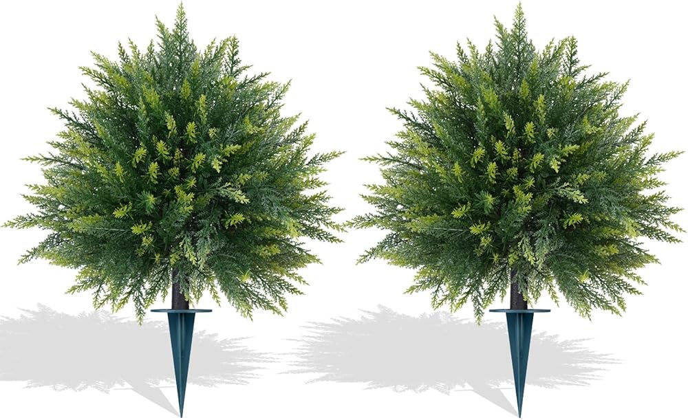 أشجار توبياري أرز اصطناعية مع ارتفاع أرضي، قطعتان من شجيرات الصنوبر المزيفة، نباتات شجرة السرو الصناعية المقاومة للأشعة فوق البنفسجية للمزارعين الداخليين والخارجيين والشرفة الأمامية