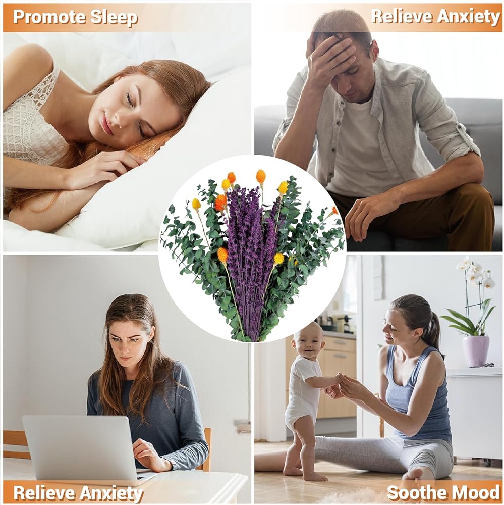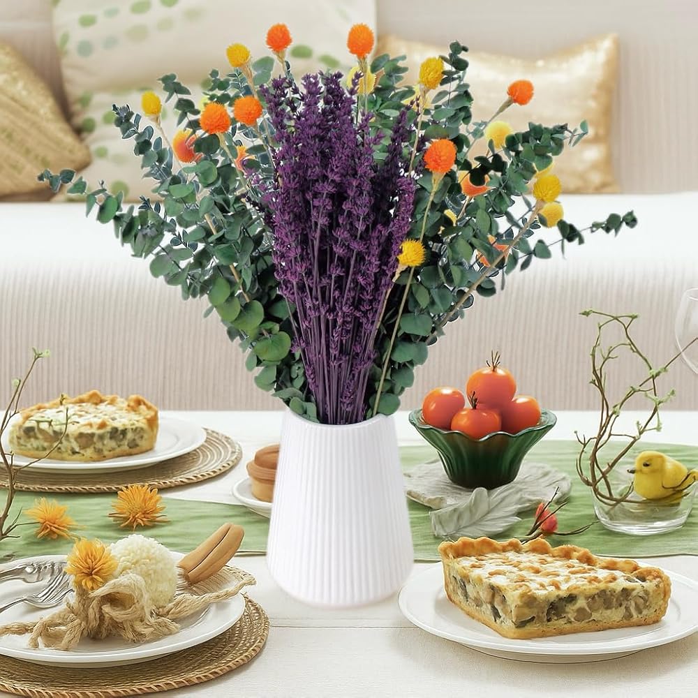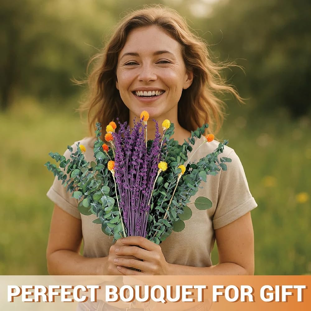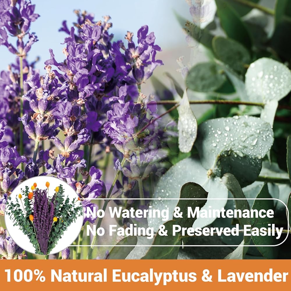 • [تناغم الألوان الغامق]: يتميز بالخزامى الأرجواني الغني، والقطيفة الكروية البرتقالية والأصفر الزاهية، والأوكالبتوس الأخضر العميق - مما يخلق تأثيرًا بصريًا دافئًا وحيويًا لأي غرفة.