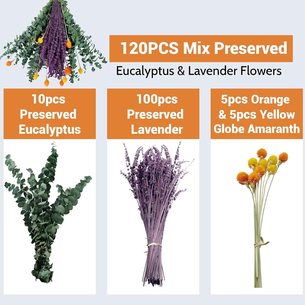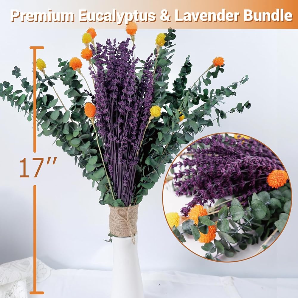 120 قطعة من الأوكالبتوس المجفف الحقيقي للاستحمام وباقة اللافندر المحفوظة، قطيفة طبيعية مقاس 17 بوصة، زهور مجففة لديكور المنزل العلاجي بالروائح