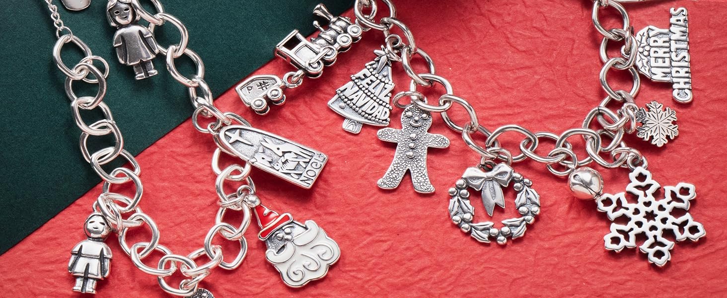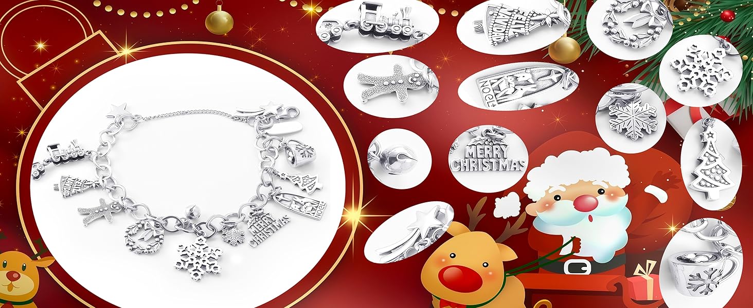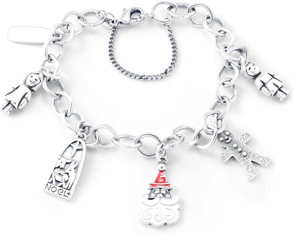 • سوار تميمة عيد الميلاد من الفضة النقية مزين بالعديد من تمائم عيد الميلاد الرائعة. قابل للتعديل، مثالي لتقديم هدايا العطلات